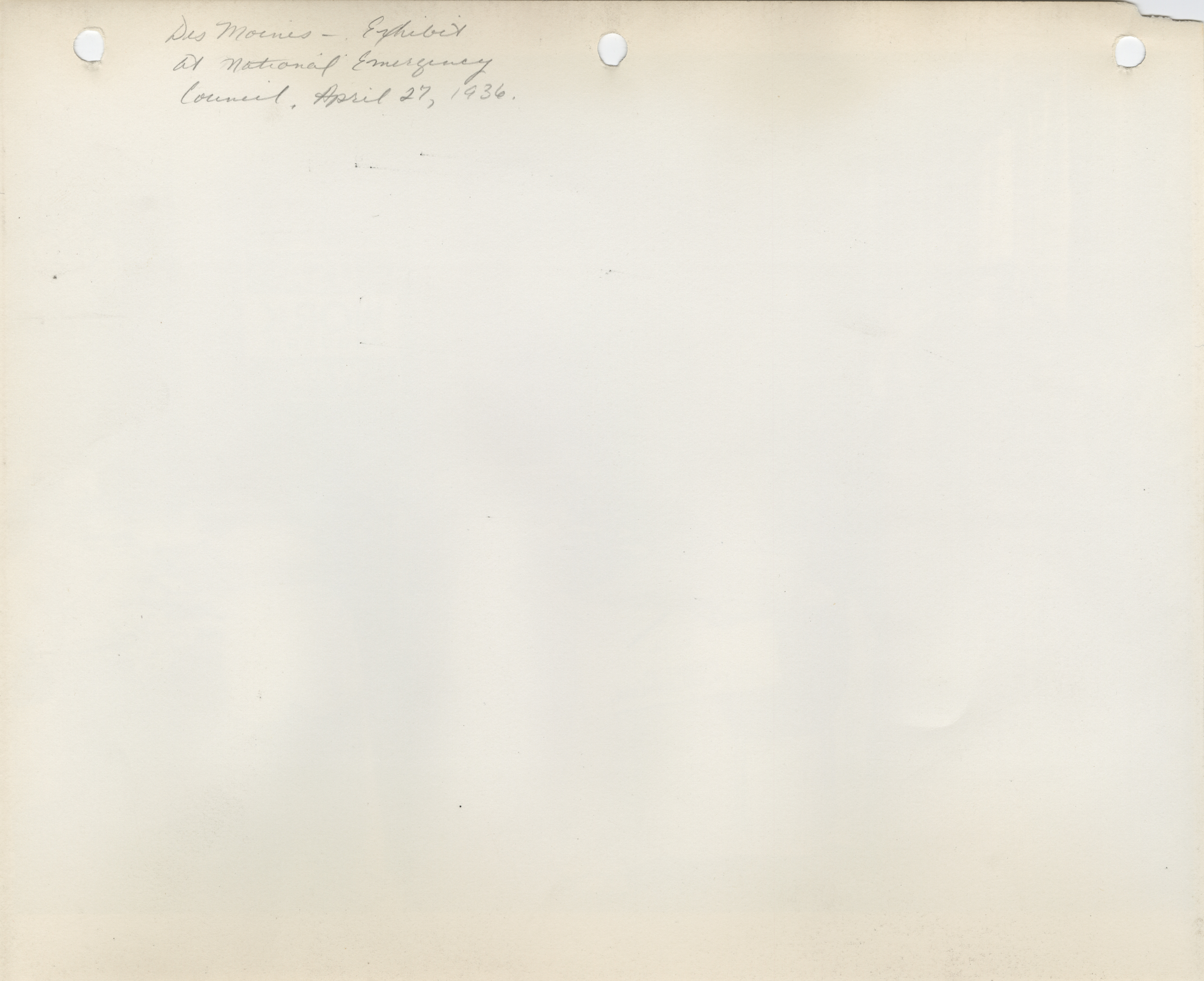 - Exhibits. Des Moines. Exhibit at National Emergency Council Meeting. April 27, 1936. (2 b/w photographs), 1936