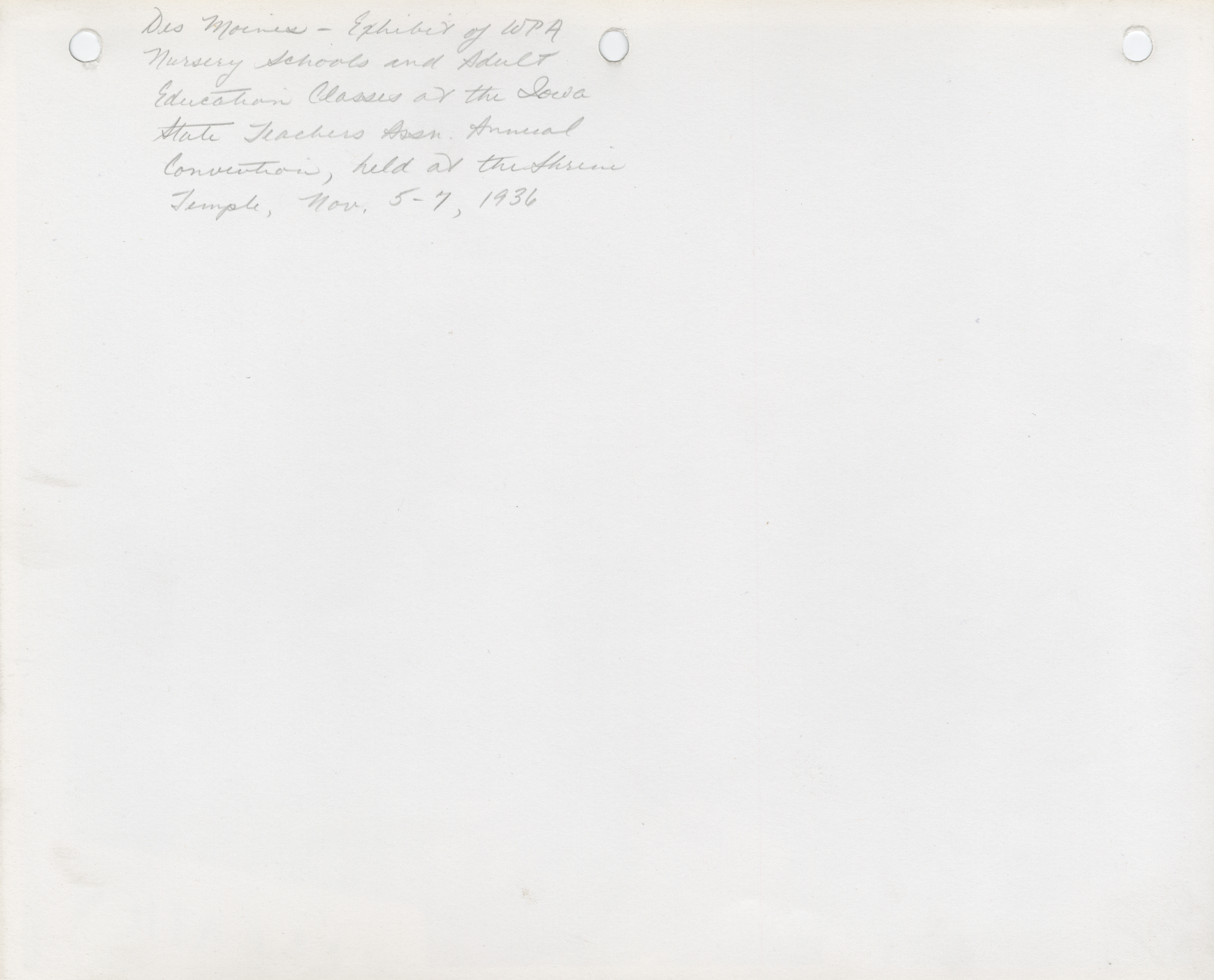 - Exhibits. Des Moines. Exhibit on WPA Nursery Schools and Adult Education Classes. November 5-7, 1936. (5 b/w photographs), 1936