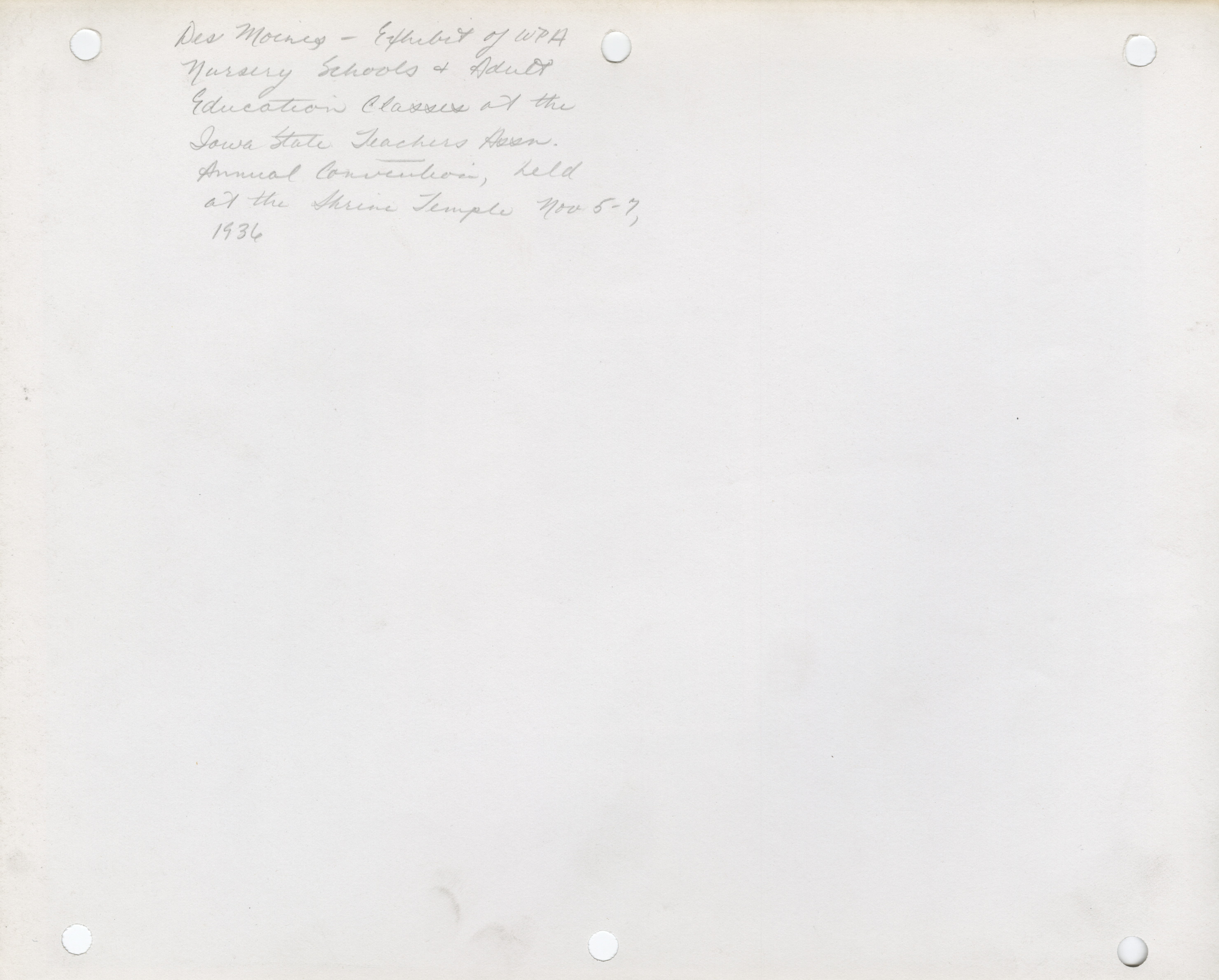 - Exhibits. Des Moines. Exhibit on WPA Nursery Schools and Adult Education Classes. November 5-7, 1936. (5 b/w photographs), 1936