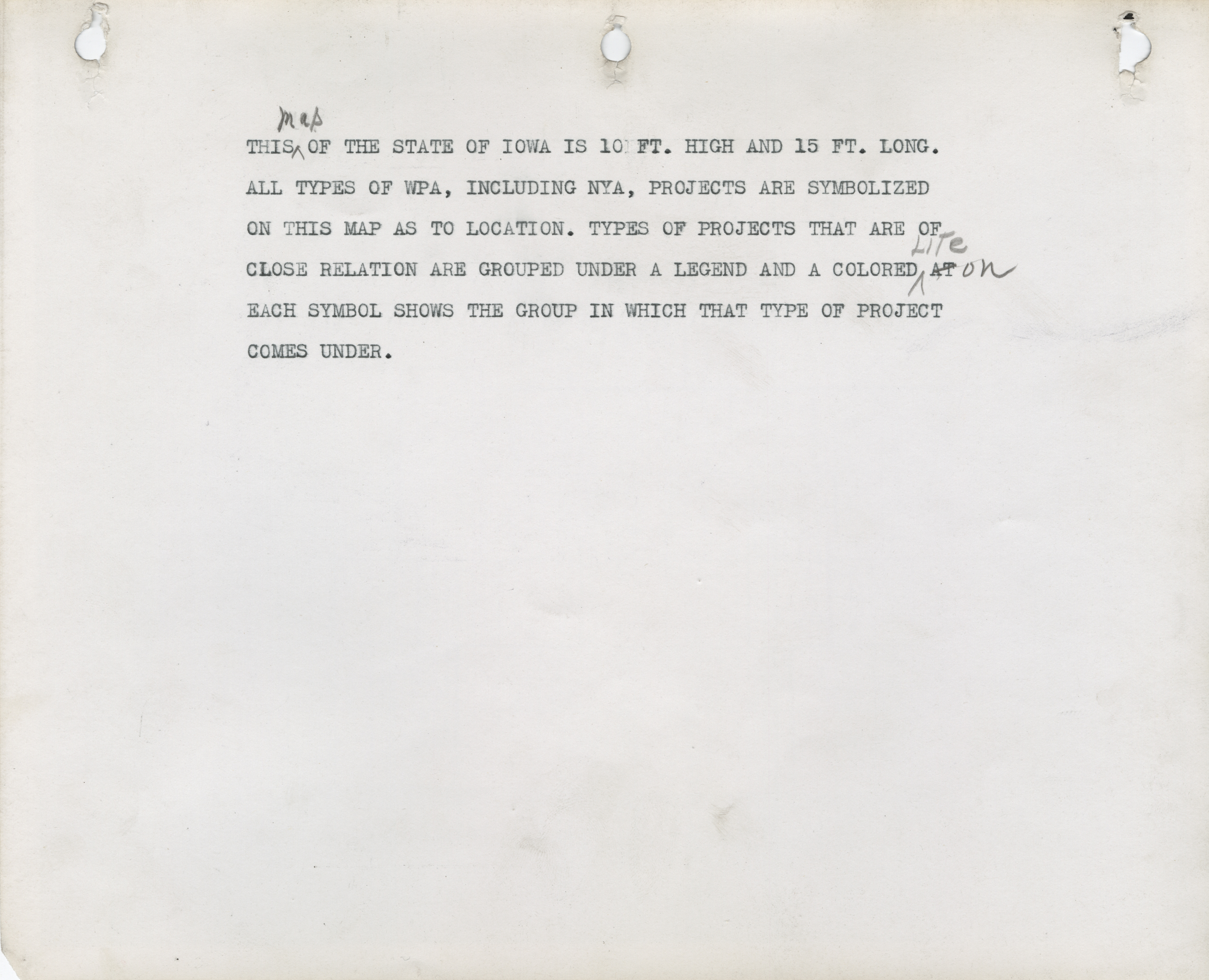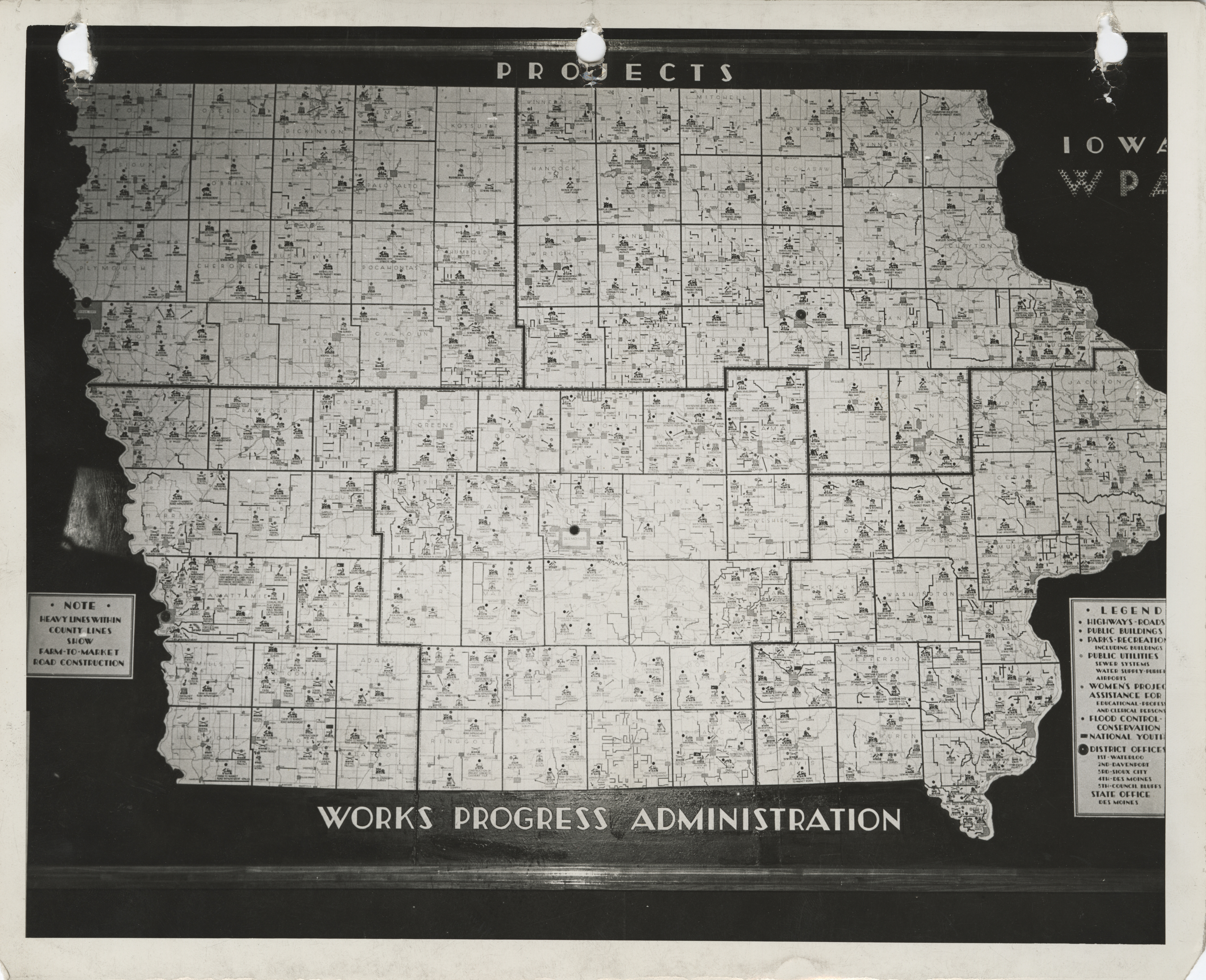 - Photograph of the Iowa State map symbolizing WPA projects as to the location