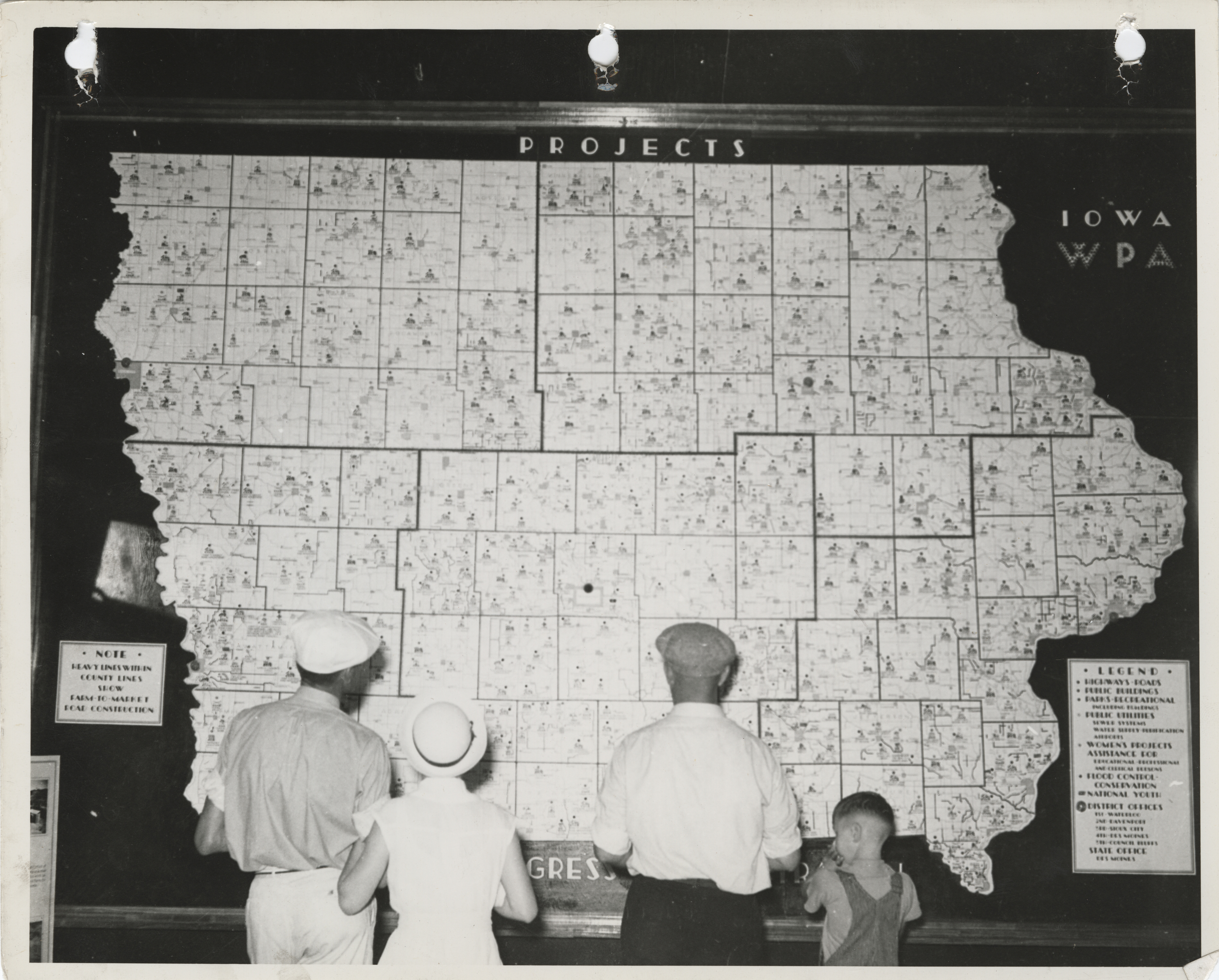 - "Photograph of people viewing the Iowa State map symbolizing WPA projects as to the location", Work Projects Administration (Iowa) Photographs, Iowa State University Library Digital Collections