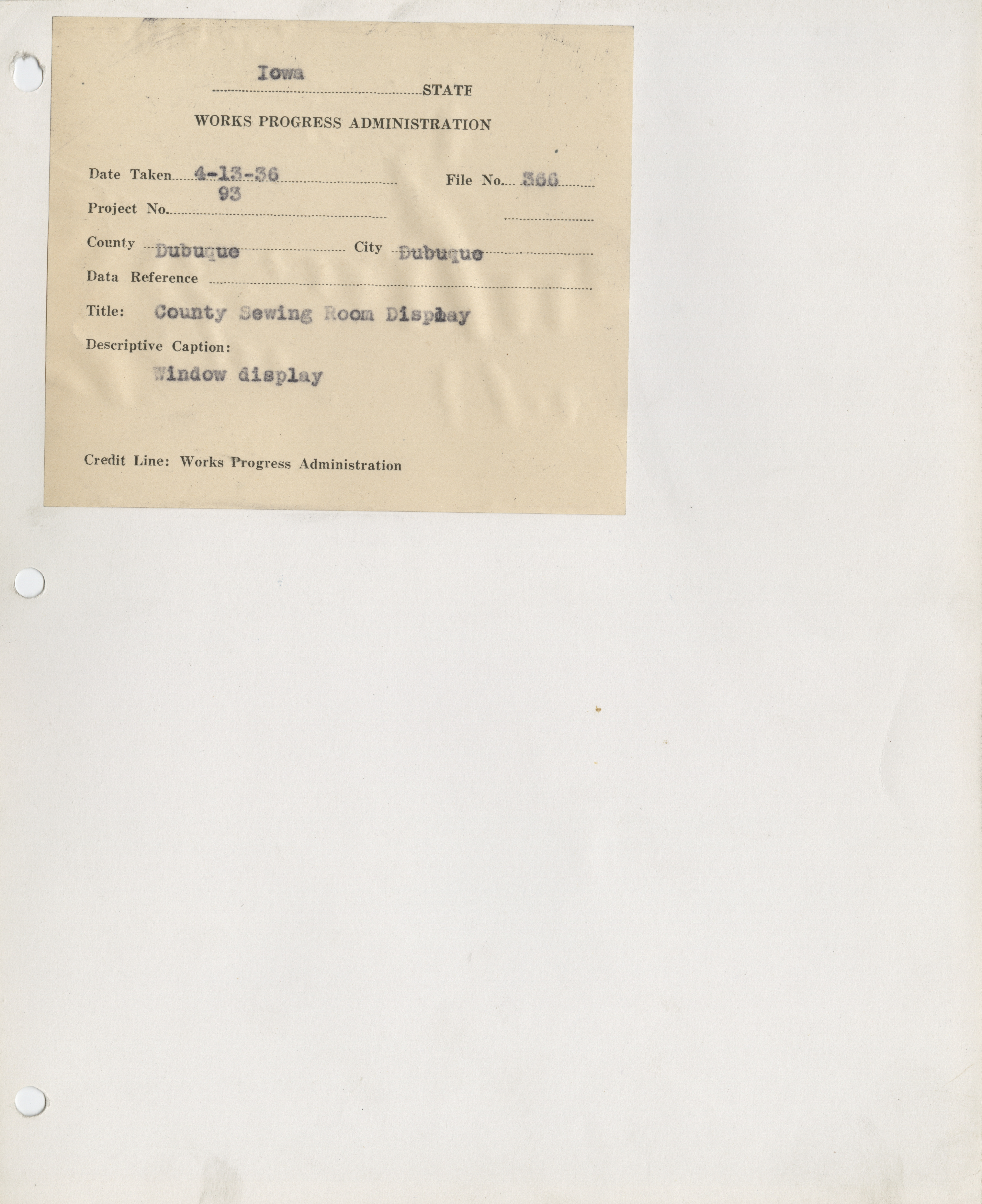 - "Photograph of the window display of the Dubuque County sewing room", Work Projects Administration (Iowa) Photographs, Iowa State University Library Digital Collections