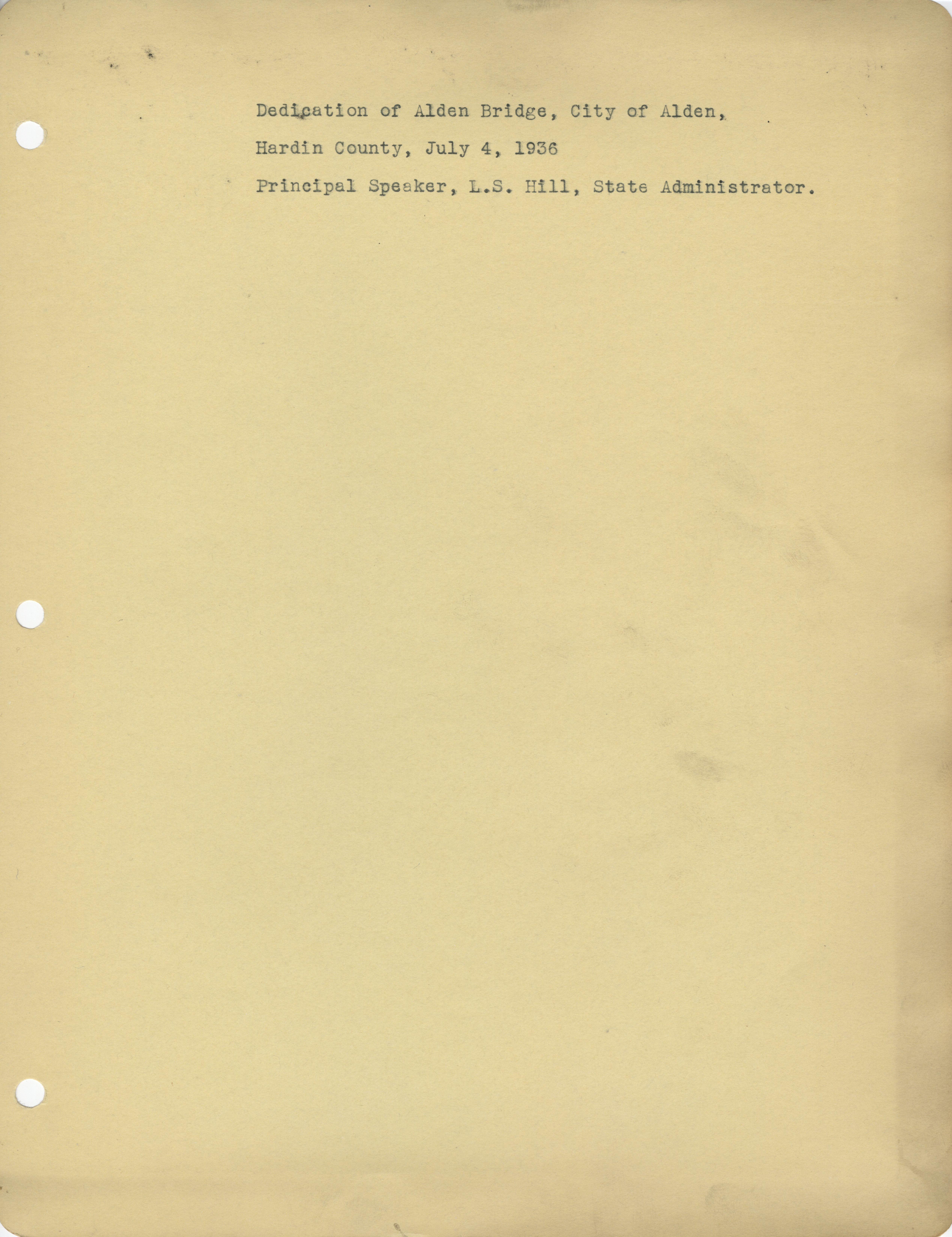 - Dedications. Alden. Bridge Dedication. WPA State Administrator L. S. Hill was the Principal Speaker on the 4th of July. (5 b/w photographs), 1936