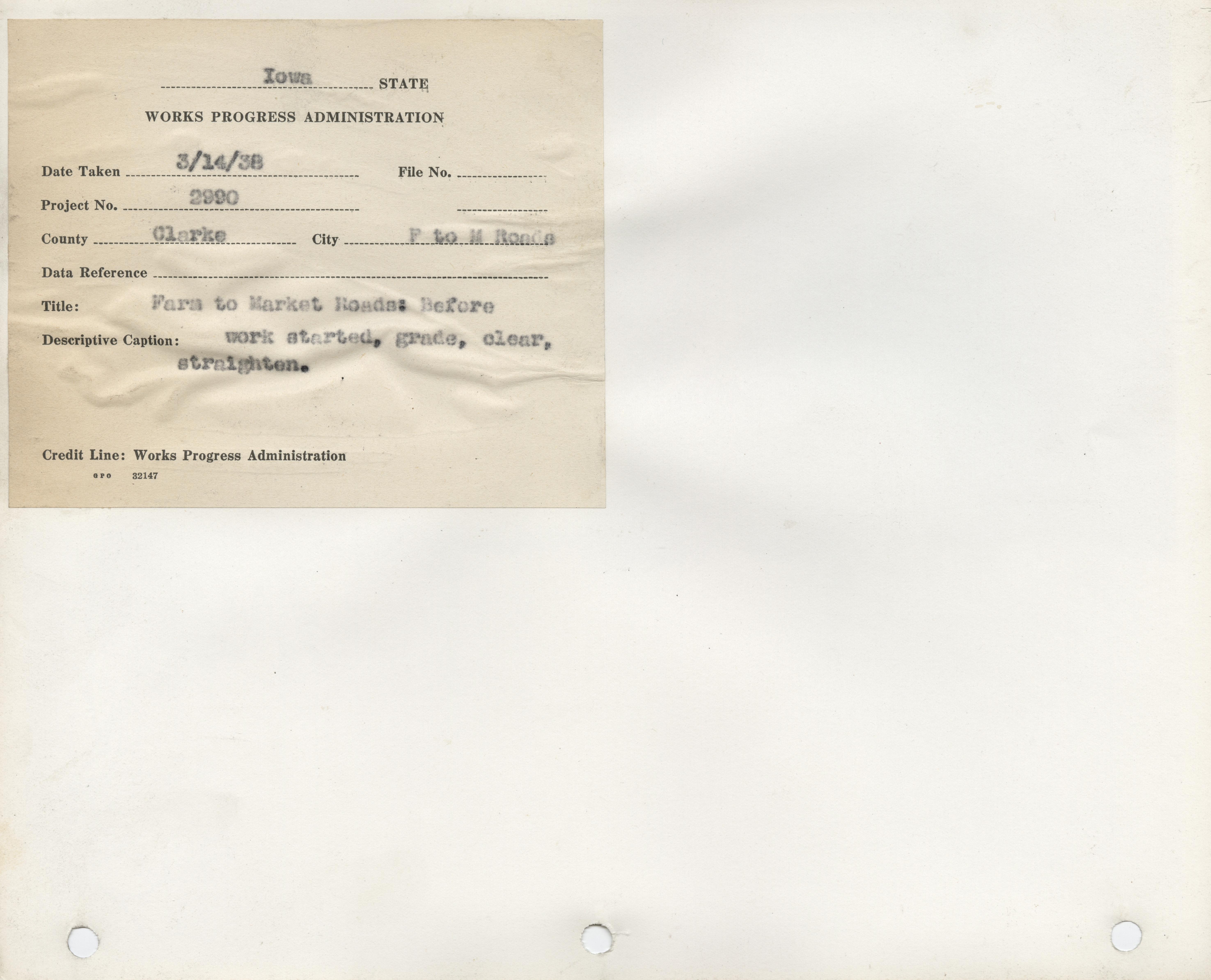 - "Photograph of farm-to-market road before the road work started in Clarke County", Work Projects Administration (Iowa) Photographs, Iowa State University Library Digital Collections