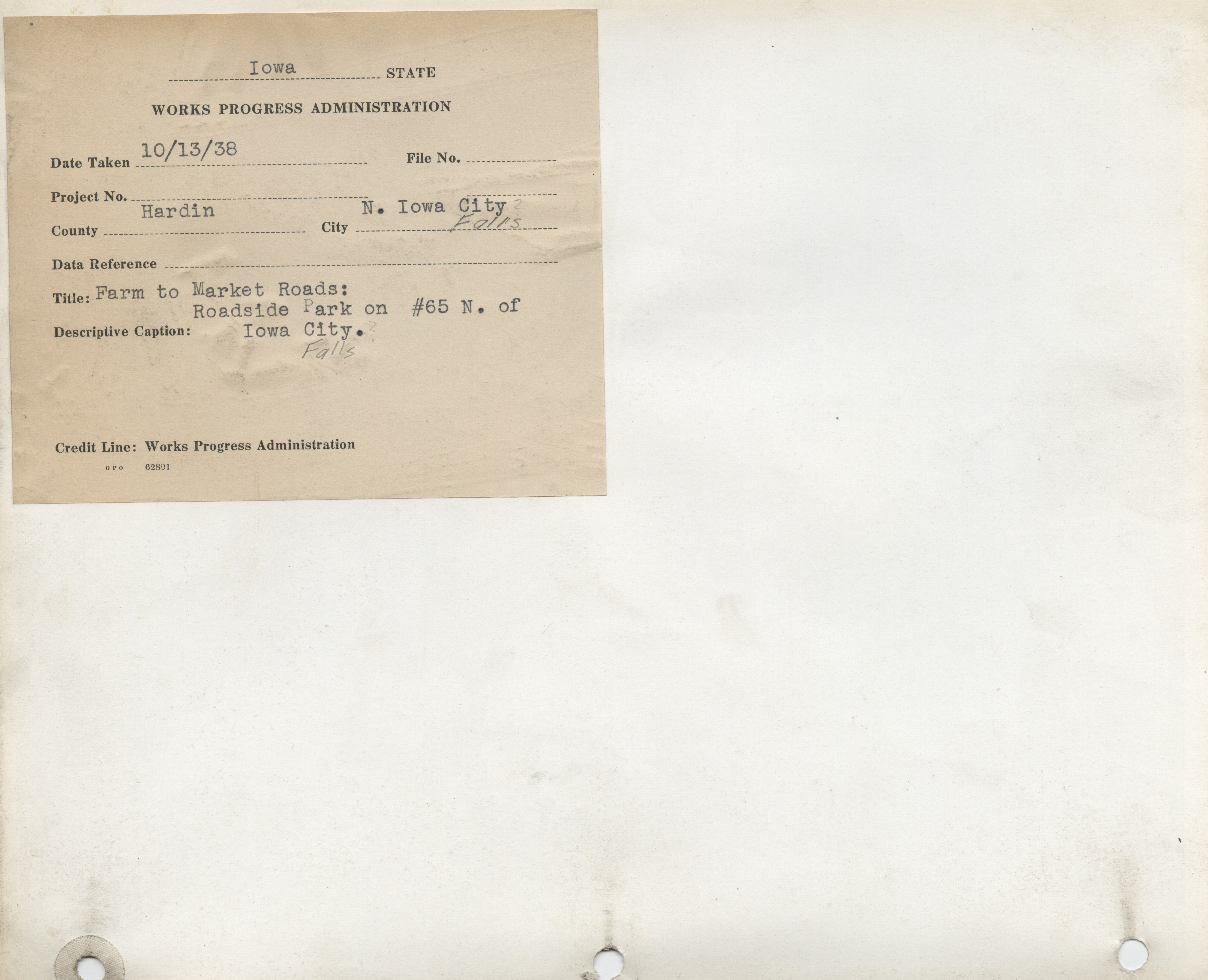 - "Photograph of the roadside park in the North of Iowa Falls", Work Projects Administration (Iowa) Photographs, Iowa State University Library Digital Collections