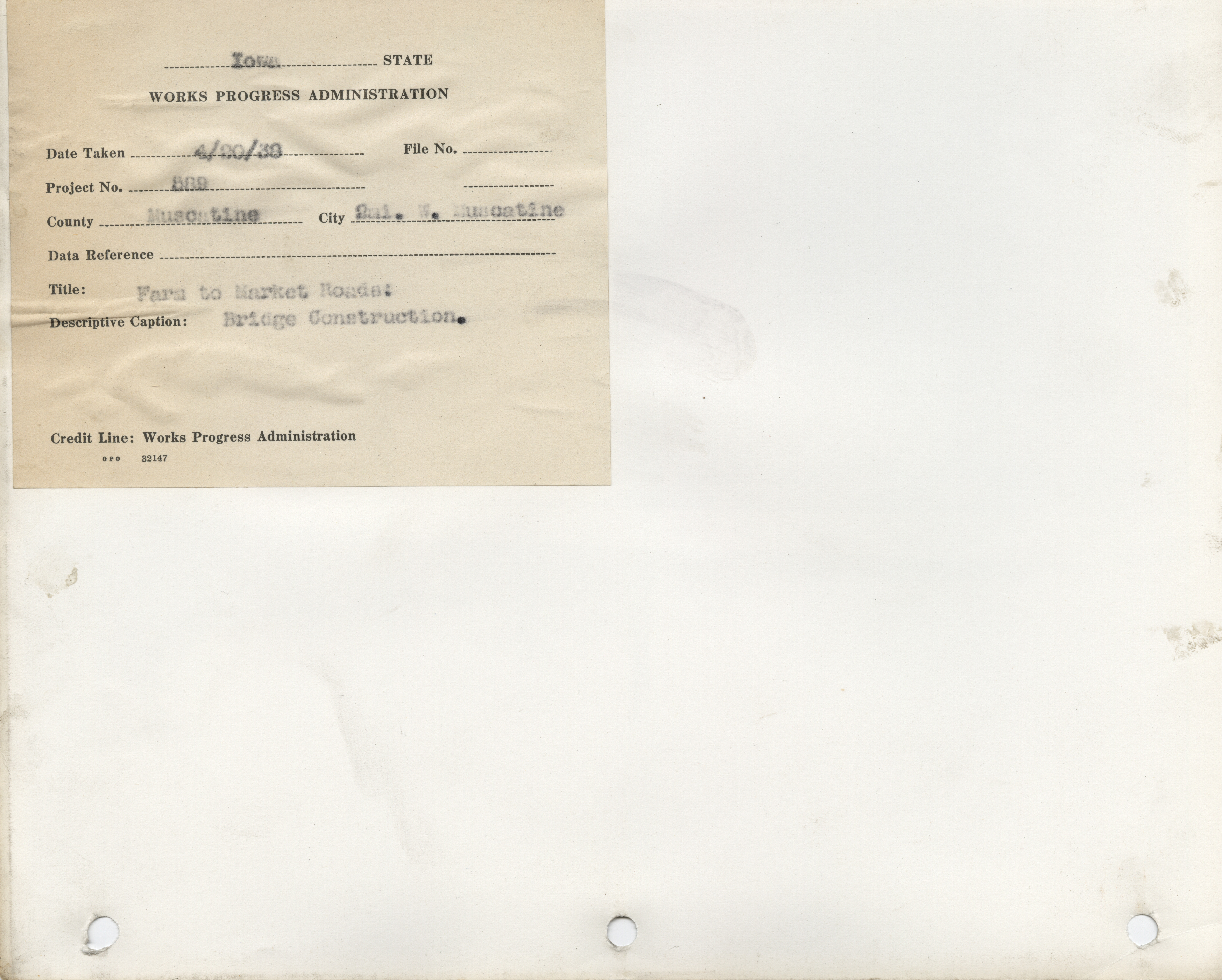 - "Photograph of bridge construction on the farm-to-market road in Muscatine County", Work Projects Administration (Iowa) Photographs, Iowa State University Library Digital Collections