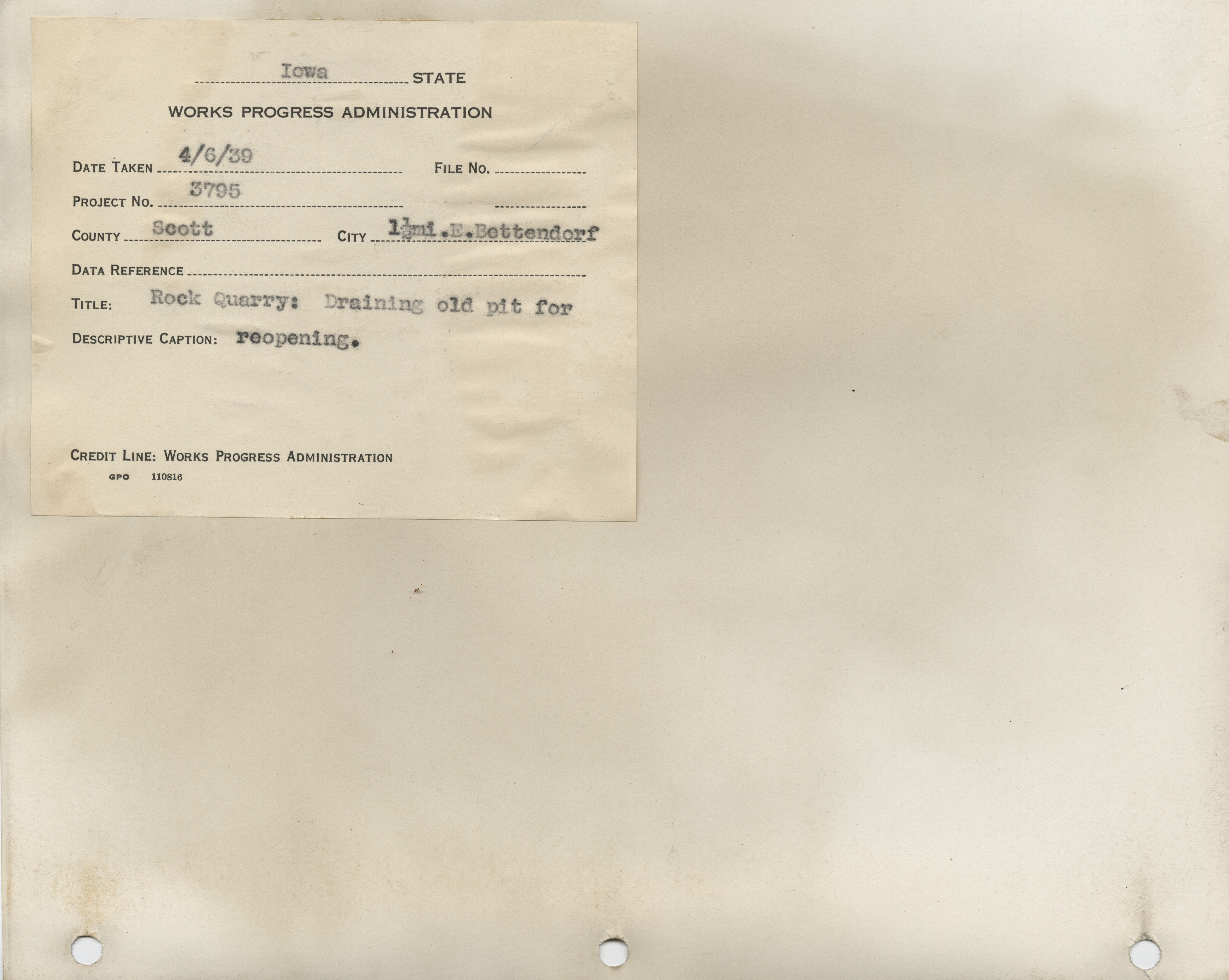 - Farm to Market Roads. Scott County. Bettendorf. Rock Quarry. Project 3795. (2 b/w photographs), 1939