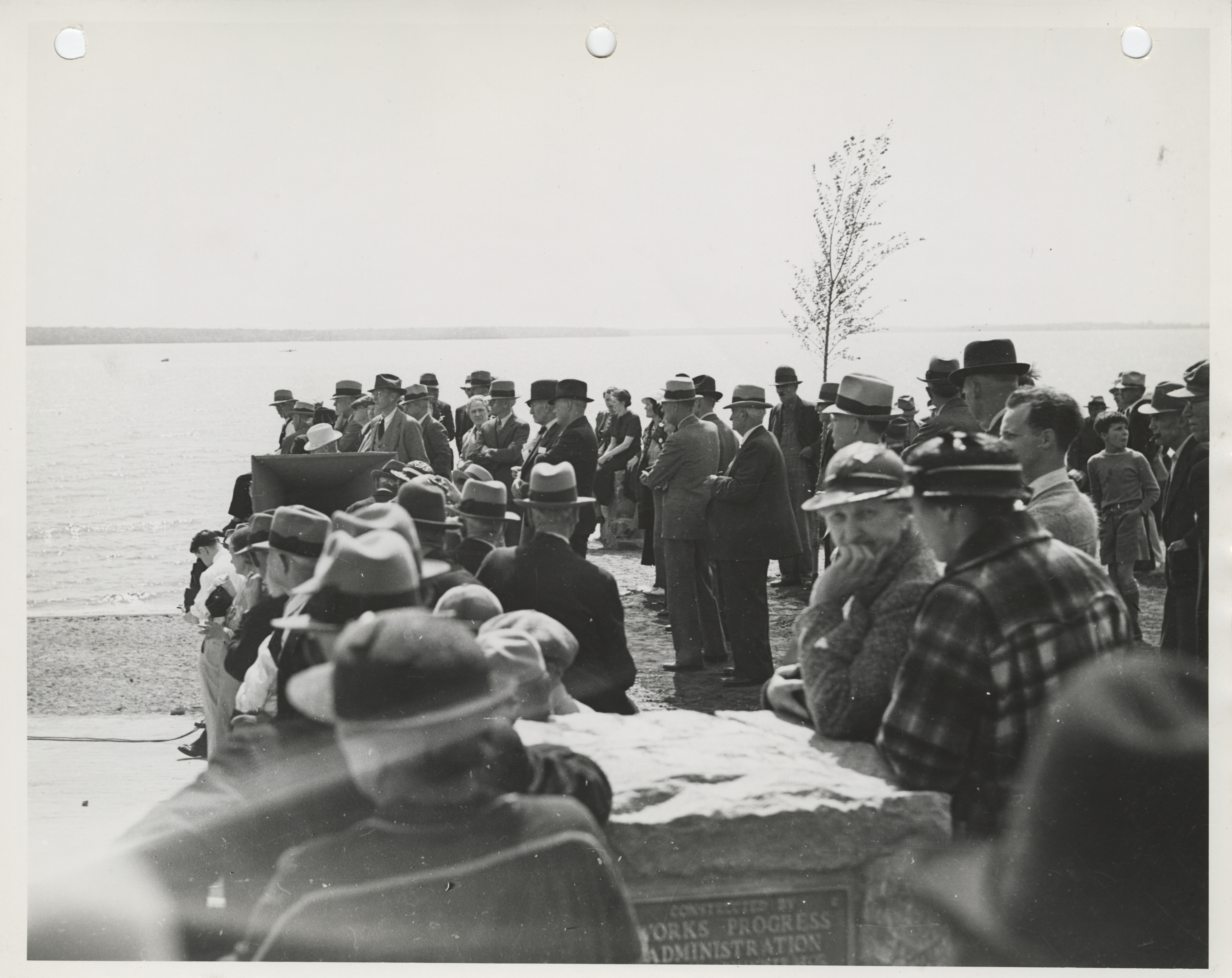 - "Photograph of group of people gathered during the dedication of lakeshore improvements event", Work Projects Administration (Iowa) Photographs, Iowa State University Library Digital Collections