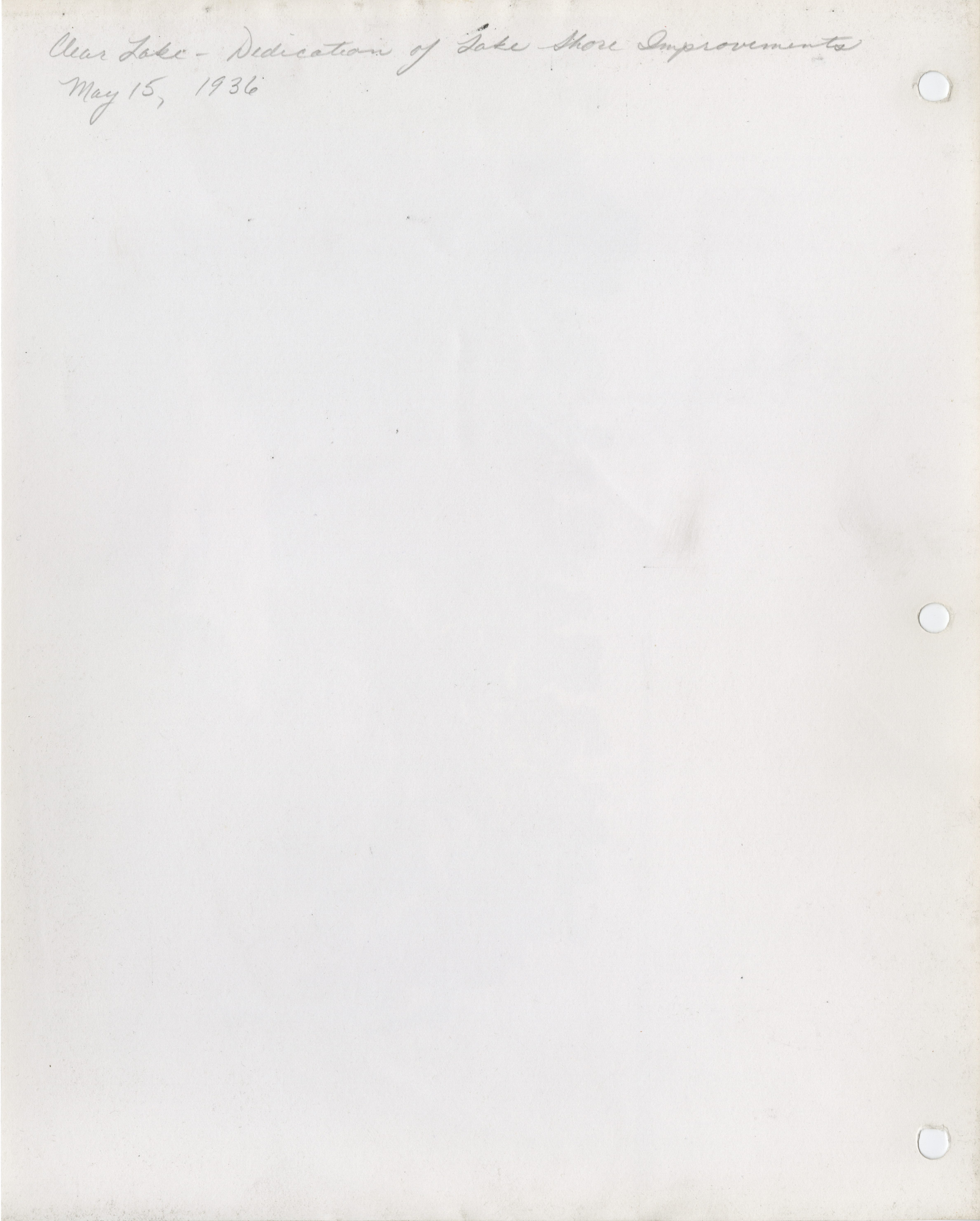 - Dedications. Clear Lake. Dedication of Lakeshore Improvements. Alan Johnson, Special Assistant to the Administrator, was the Principal Speaker. (6 b/w photographs), 1936