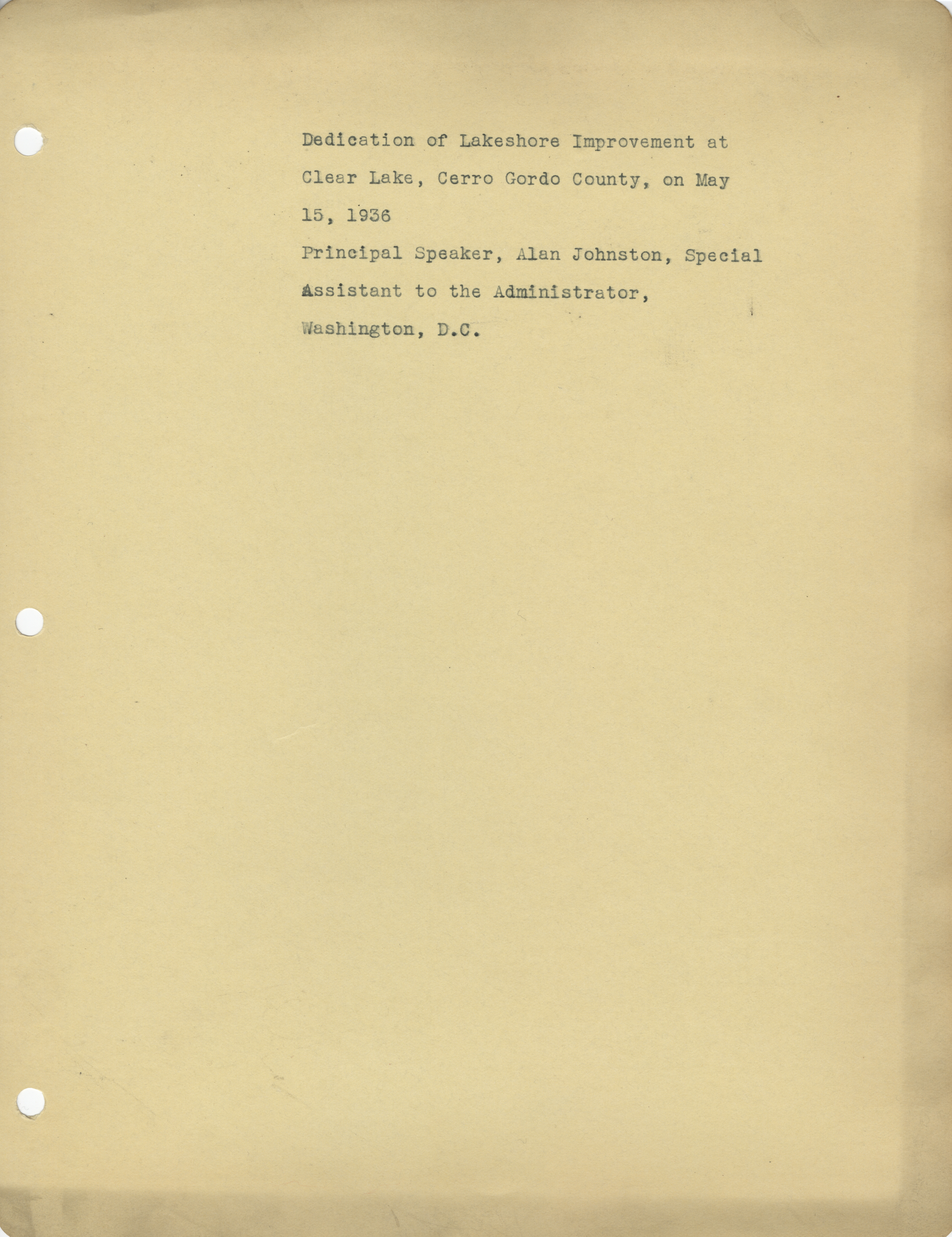 - Dedications. Clear Lake. Dedication of Lakeshore Improvements. Alan Johnson, Special Assistant to the Administrator, was the Principal Speaker. (6 b/w photographs), 1936