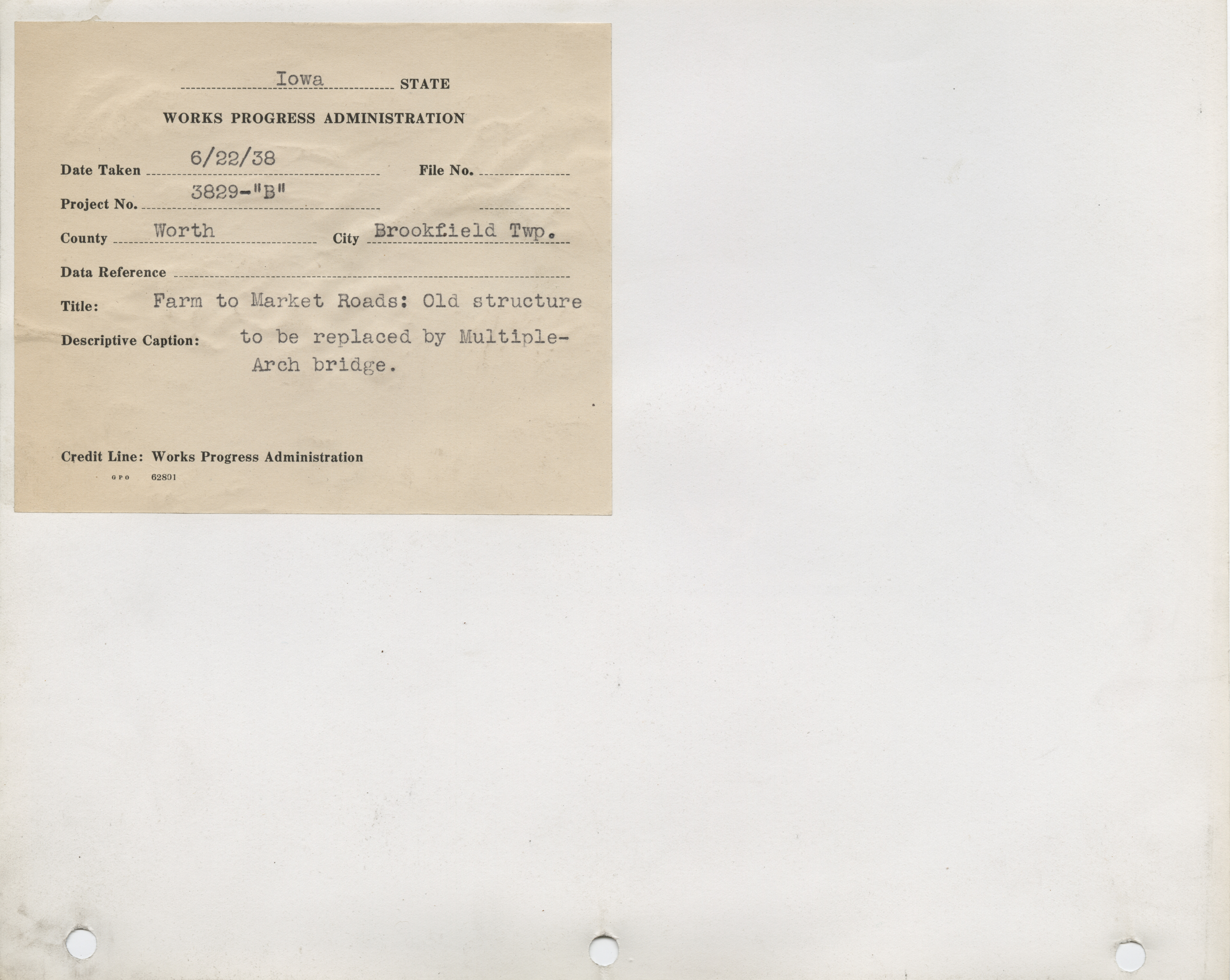- "Photograph of the construction of multiple arch bridge in Brookfield Township", Work Projects Administration (Iowa) Photographs, Iowa State University Library Digital Collections
