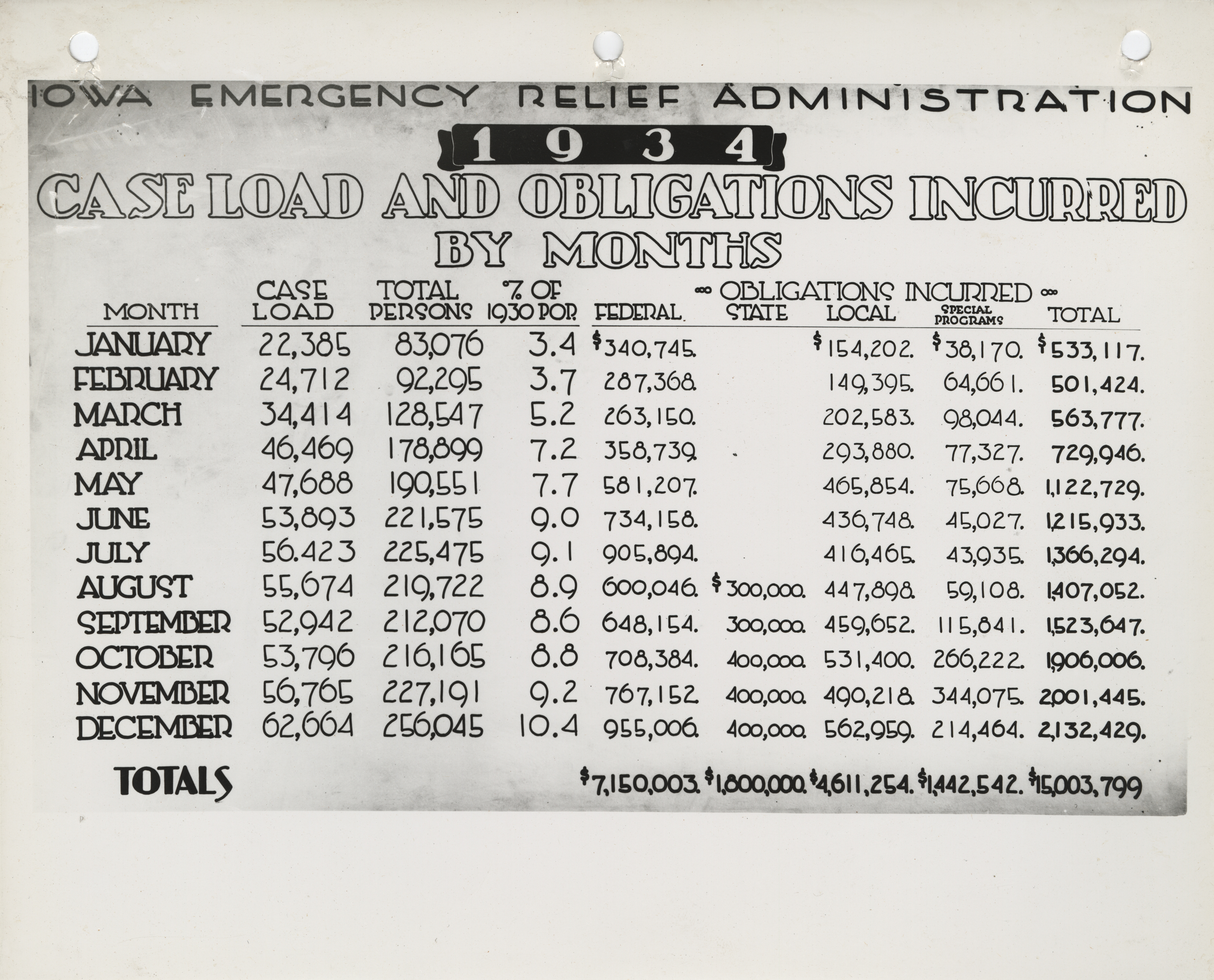 - "Statistical report of the caseload and obligations incurred by the Iowa Emergency Relief Administration in 1934", Work Projects Administration (Iowa) Photographs, Iowa State University Library Digital Collections