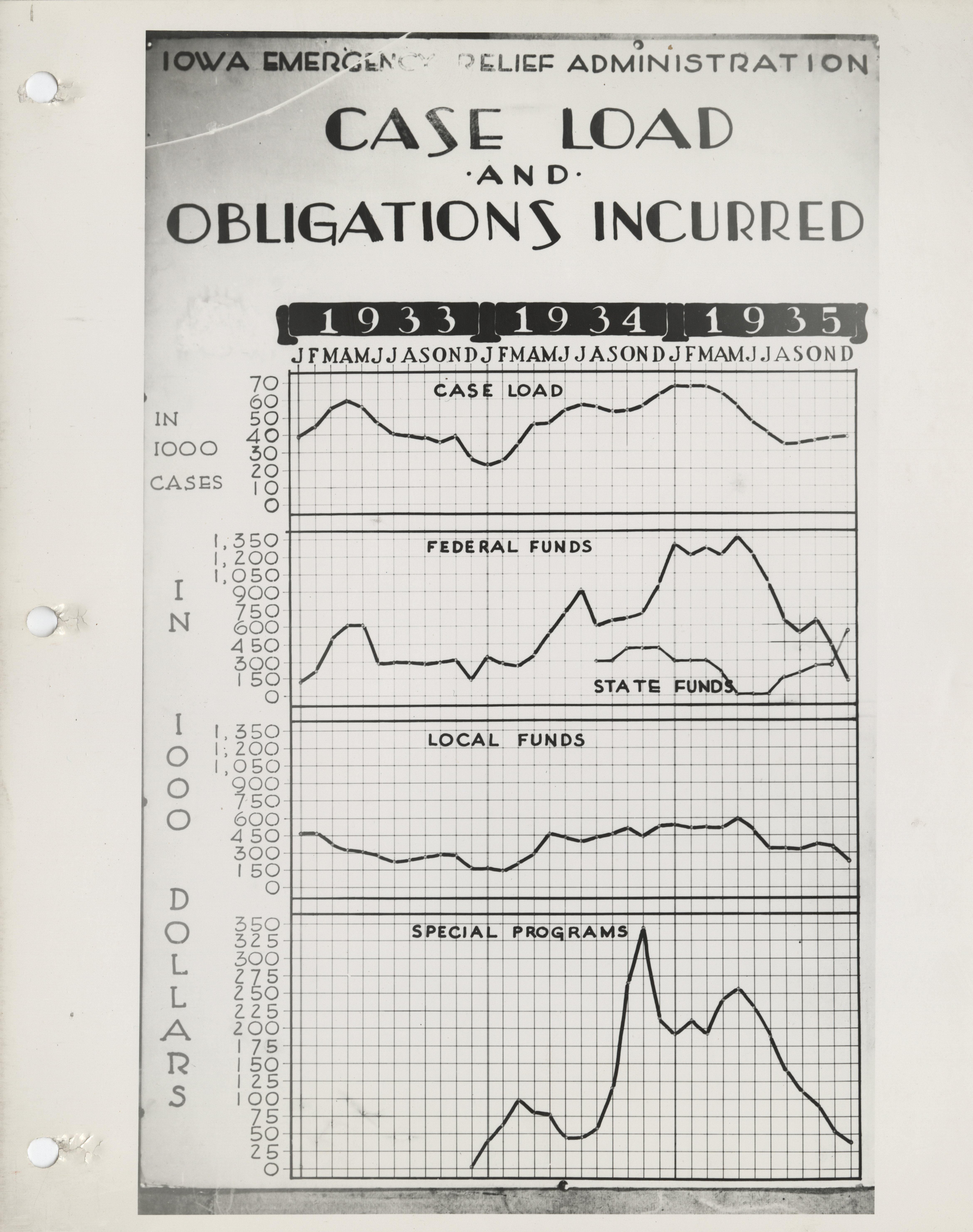 - "Graphs of the caseload and obligations incurred by the Iowa Emergency Relief Administration from 1933 to 1935", Work Projects Administration (Iowa) Photographs, Iowa State University Library Digital Collections