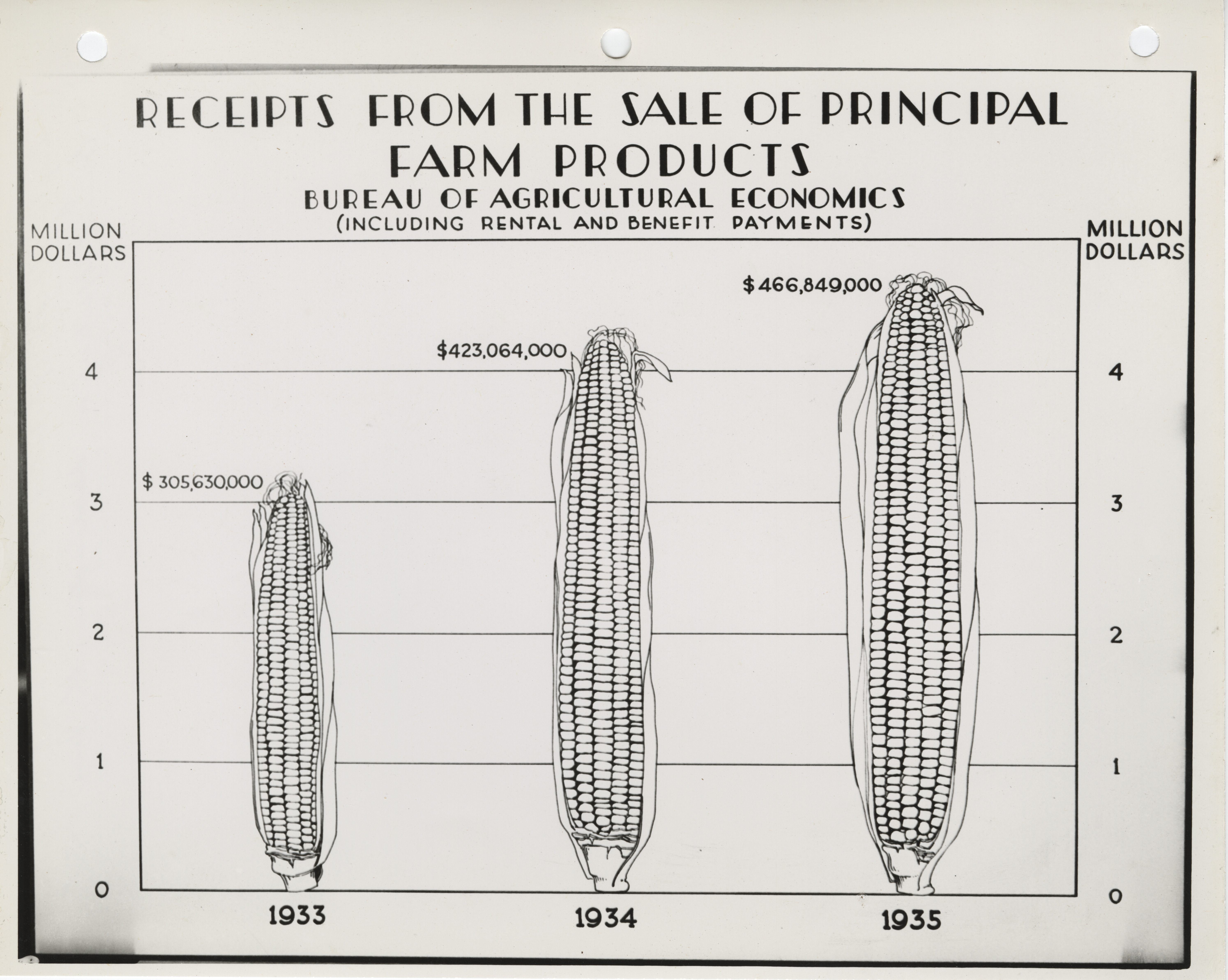 - "Graph of the receipts from the sale of principal farm products from 1933 to 1935", Work Projects Administration (Iowa) Photographs, Iowa State University Library Digital Collections