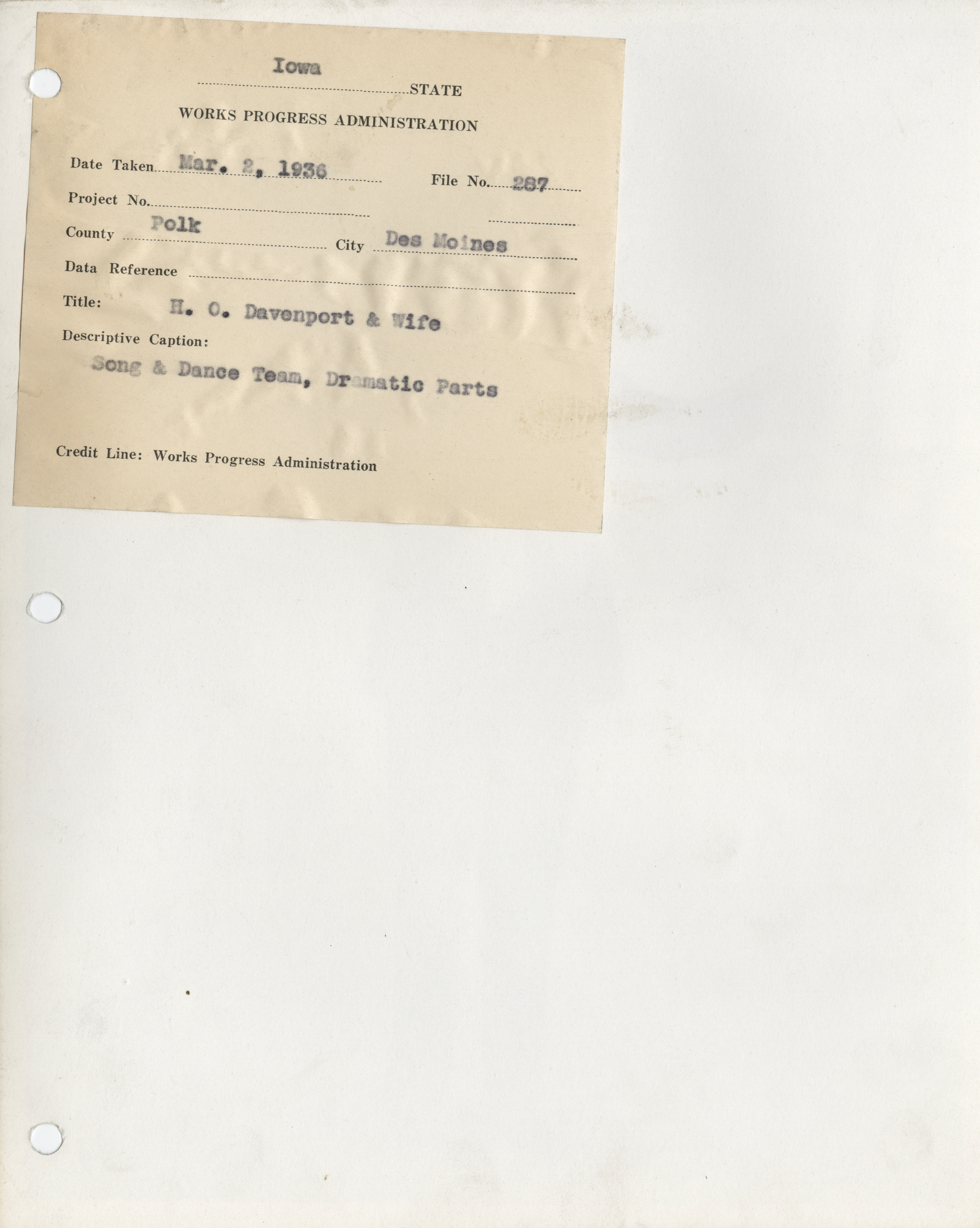 - Musicians--Actors. Des Moines. H.O. Davenport and Wife, Song and Dance Team. (3 b/w photographs), 1936