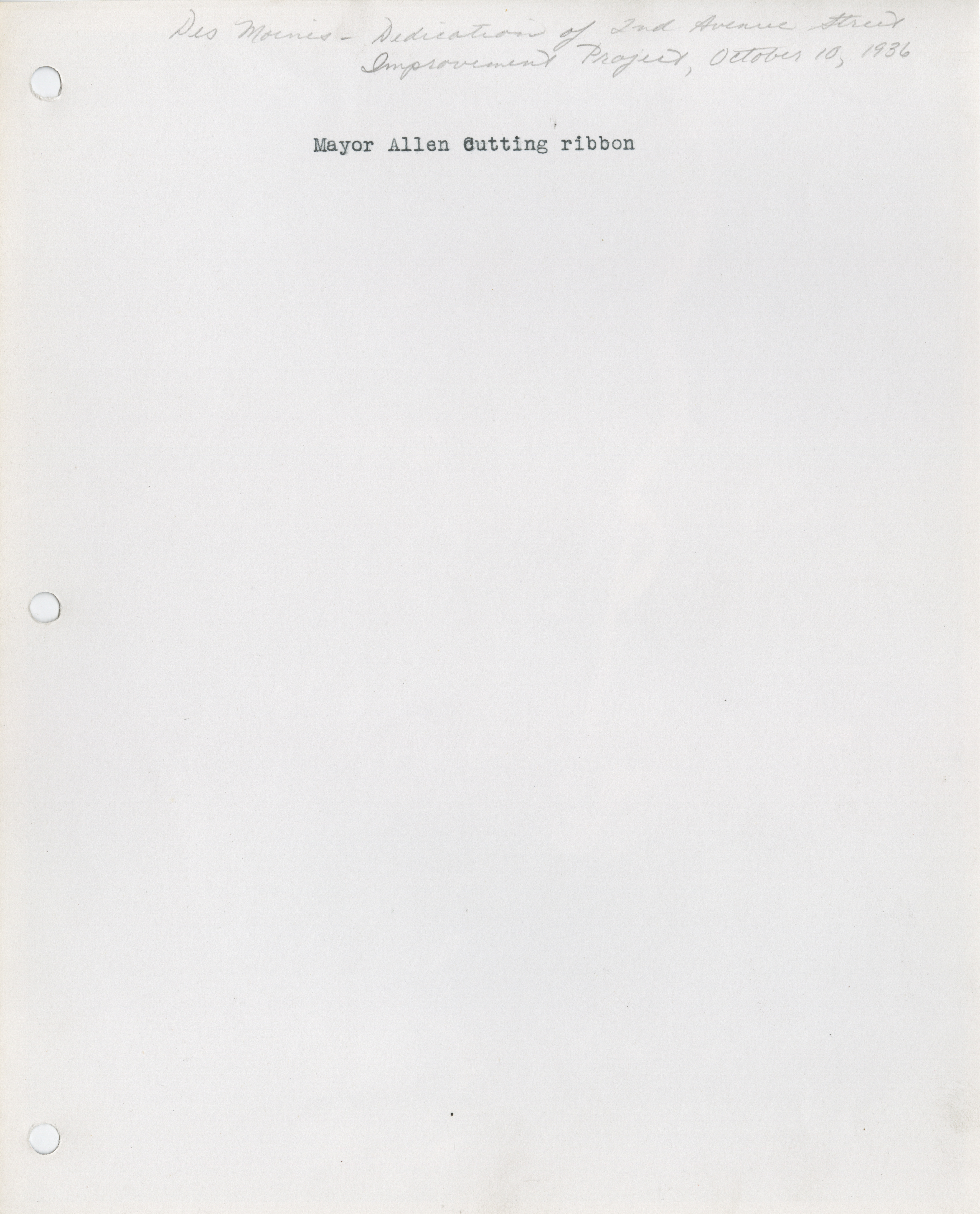- Dedications. Des Moines. Dedication of 2nd Avenue Improvement Project. Principal speakers were Harry Snyder, Chairman of the Project Workers committee and Harold Tillson, Polk County WPA Engineer. October 10, 1936. (7 b/w photographs), 1936