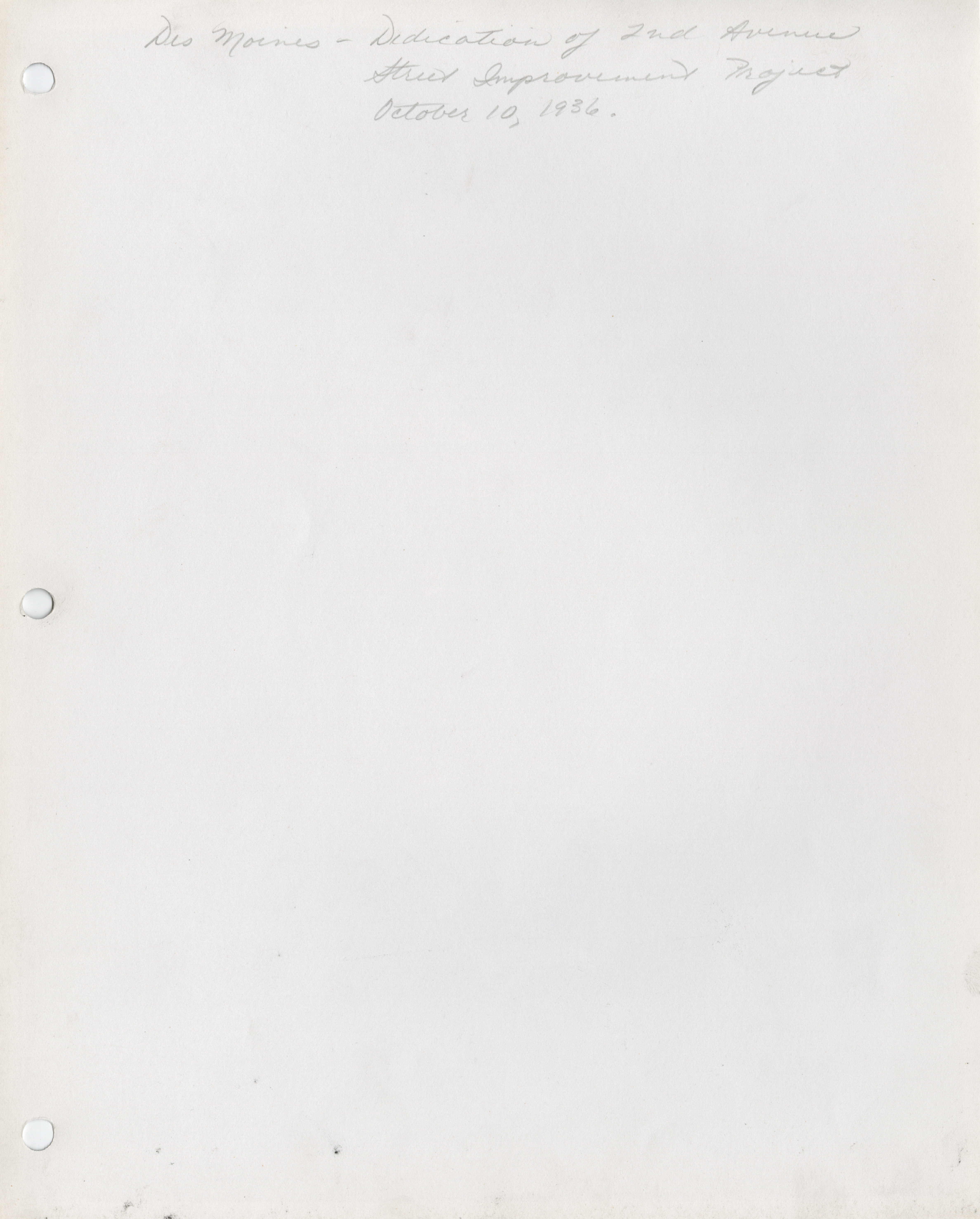 - Dedications. Des Moines. Dedication of 2nd Avenue Improvement Project. Principal speakers were Harry Snyder, Chairman of the Project Workers committee and Harold Tillson, Polk County WPA Engineer. October 10, 1936. (7 b/w photographs), 1936