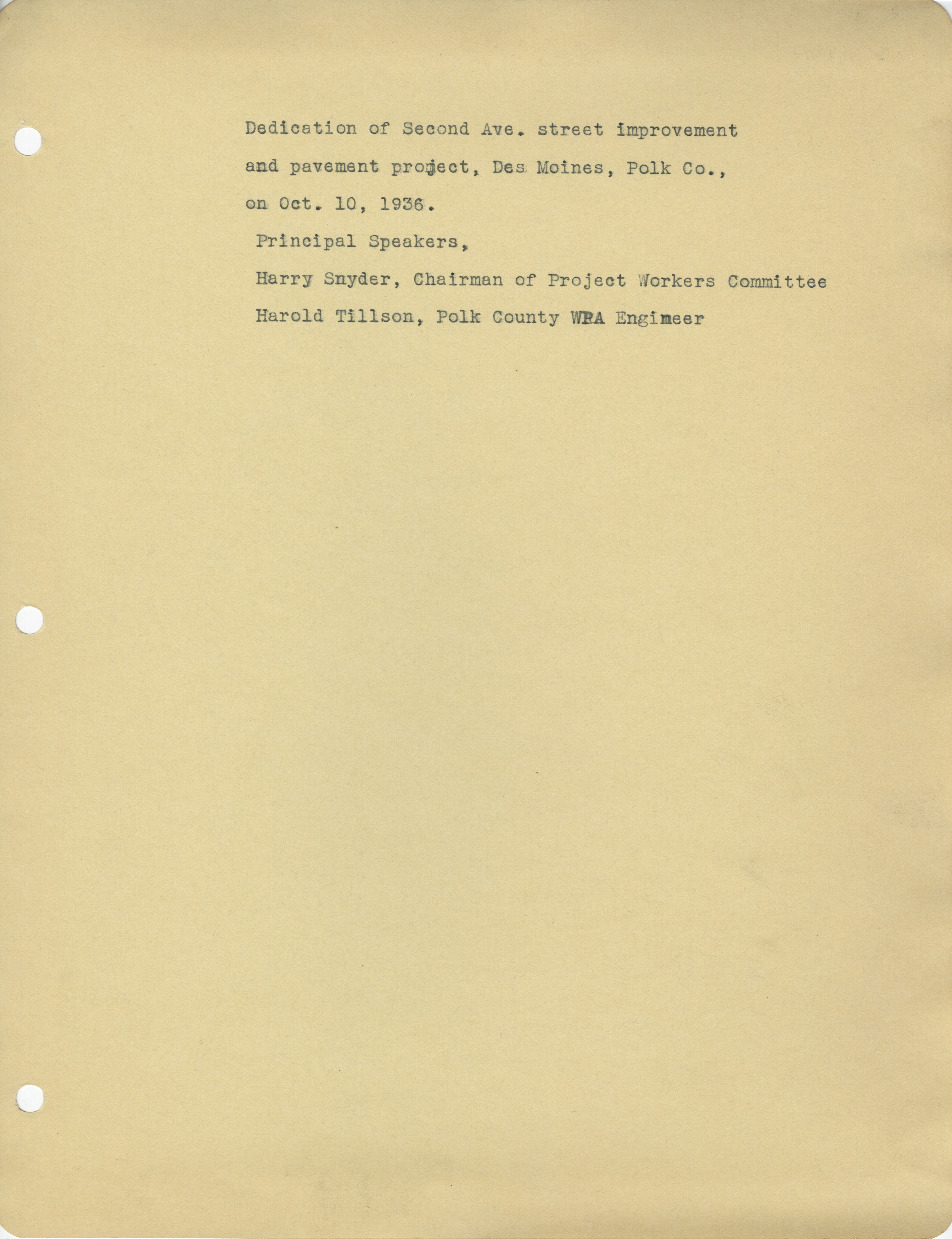 - Dedications. Des Moines. Dedication of 2nd Avenue Improvement Project. Principal speakers were Harry Snyder, Chairman of the Project Workers committee and Harold Tillson, Polk County WPA Engineer. October 10, 1936. (7 b/w photographs), 1936