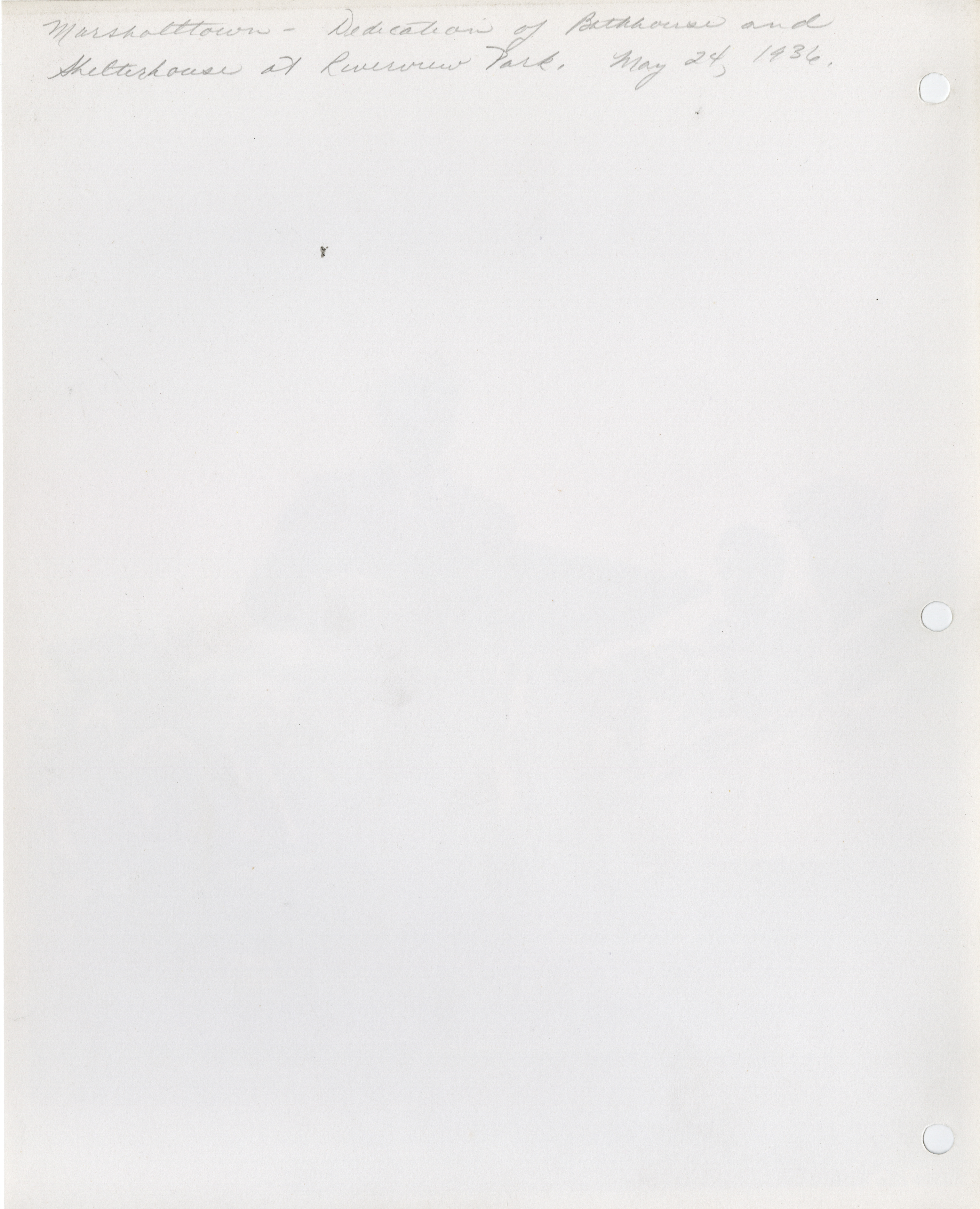 - Dedications. Marshalltown. Dedication of Bathhouse and Shelter House at Riverview Park. Principal Speaker was Fourth District Administrator Charles Lynde. May 24, 1936. (9 b/w photographs), 1936