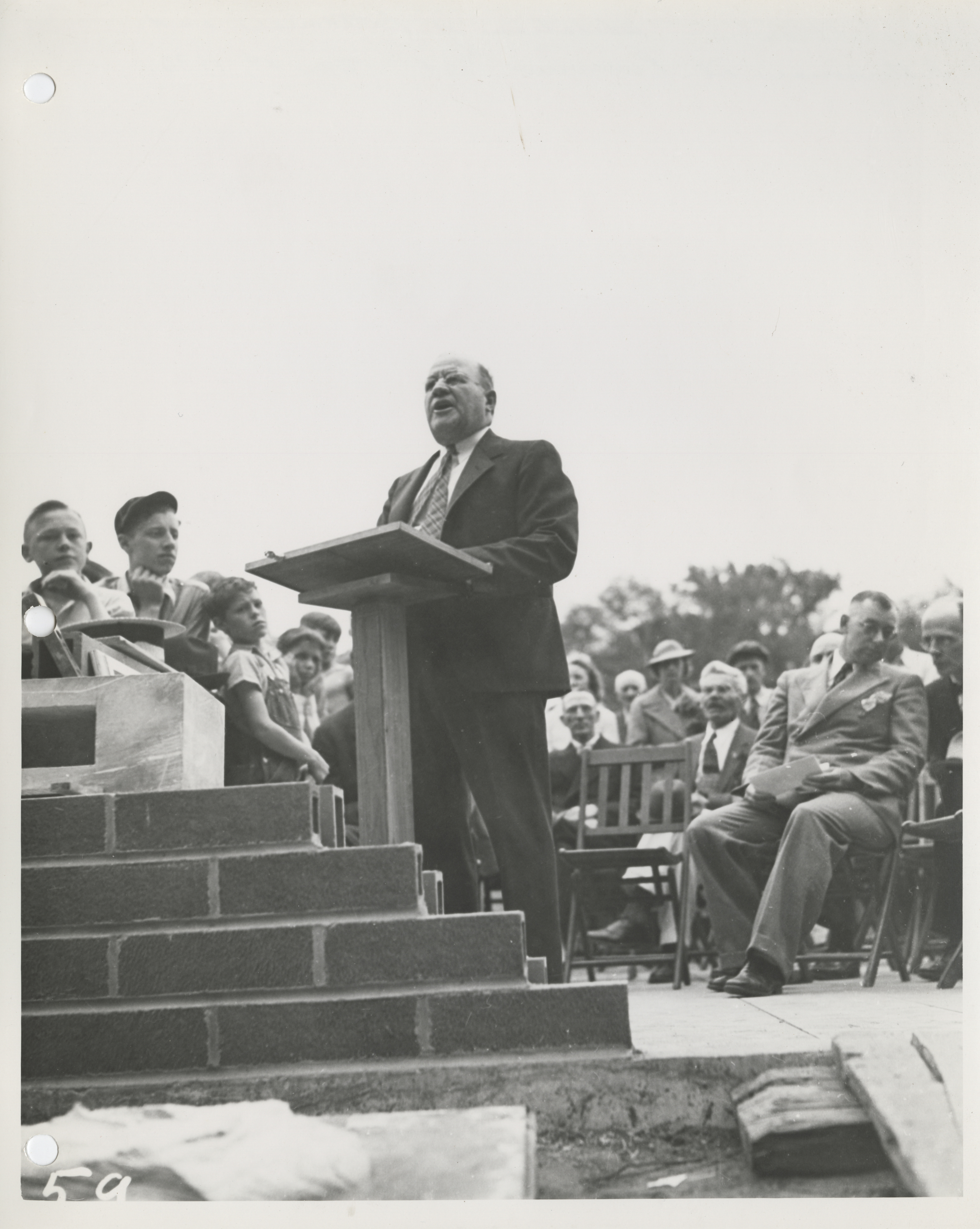 Photograph of group of people gathered during the dedication of bathhouse and shelter house in Riverview Park Item Info