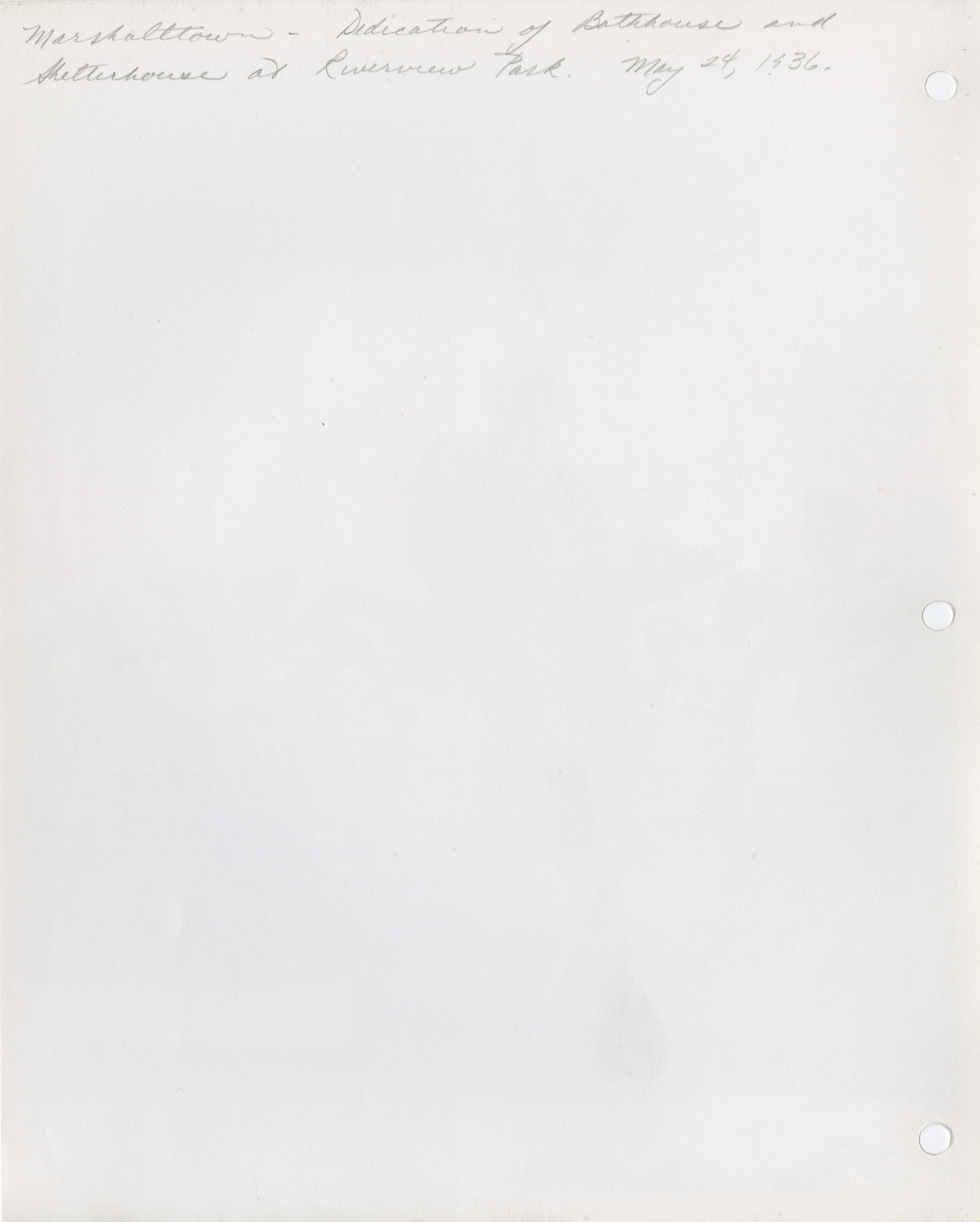 - Dedications. Marshalltown. Dedication of Bathhouse and Shelter House at Riverview Park. Principal Speaker was Fourth District Administrator Charles Lynde. May 24, 1936. (9 b/w photographs), 1936