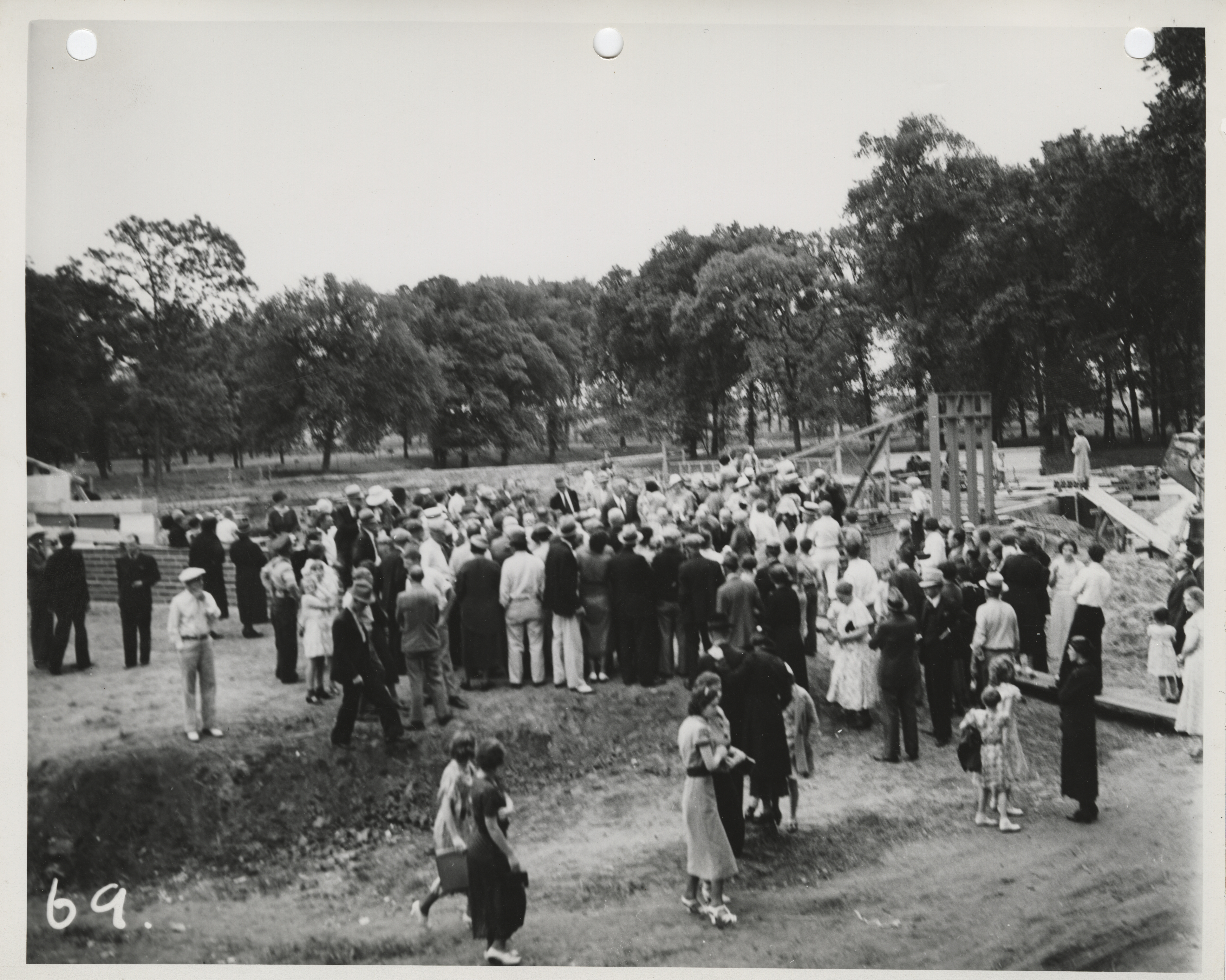 Photograph of group of people gathered during the dedication of bathhouse and shelter house in Riverview Park Item Info