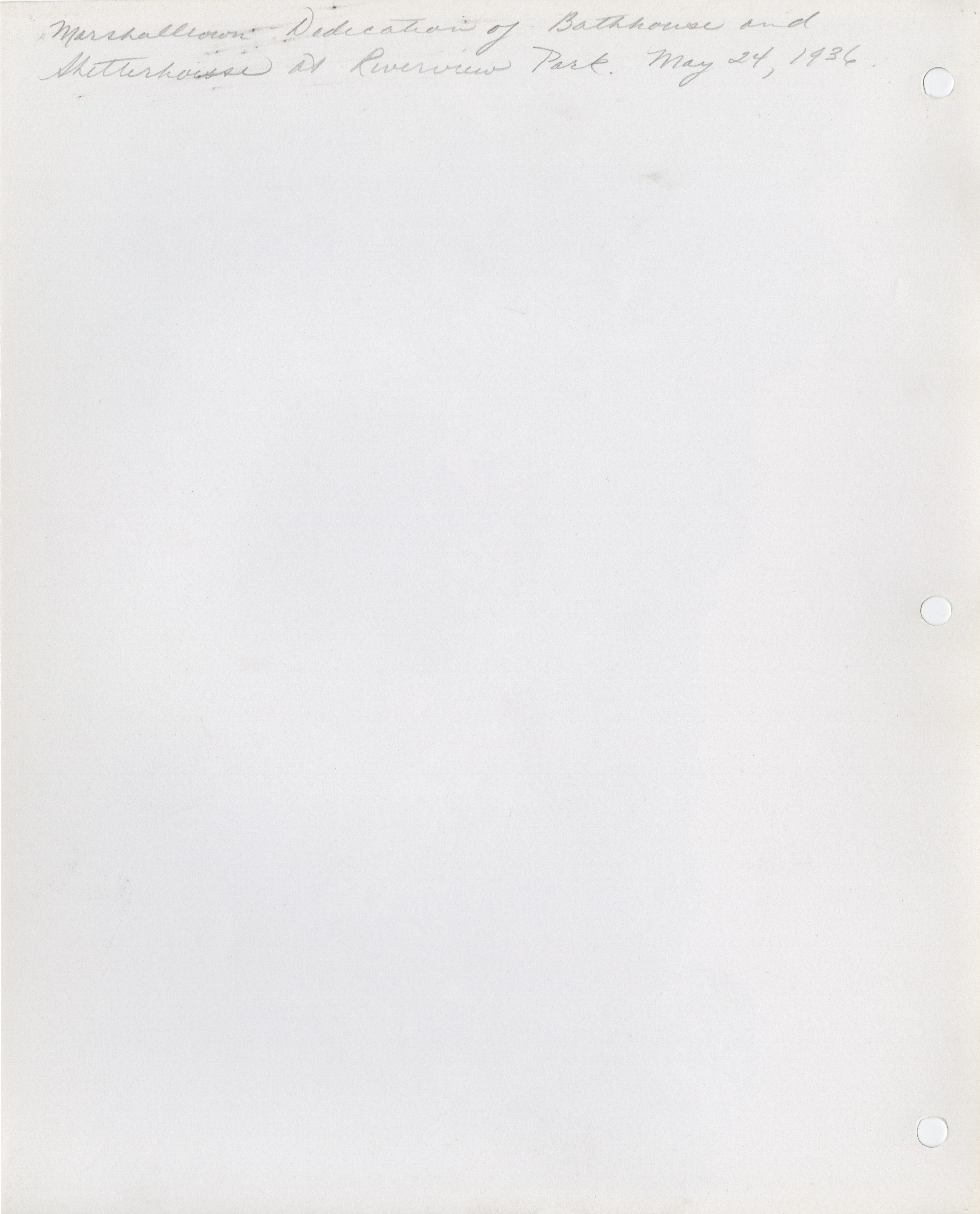 - Dedications. Marshalltown. Dedication of Bathhouse and Shelter House at Riverview Park. Principal Speaker was Fourth District Administrator Charles Lynde. May 24, 1936. (9 b/w photographs), 1936