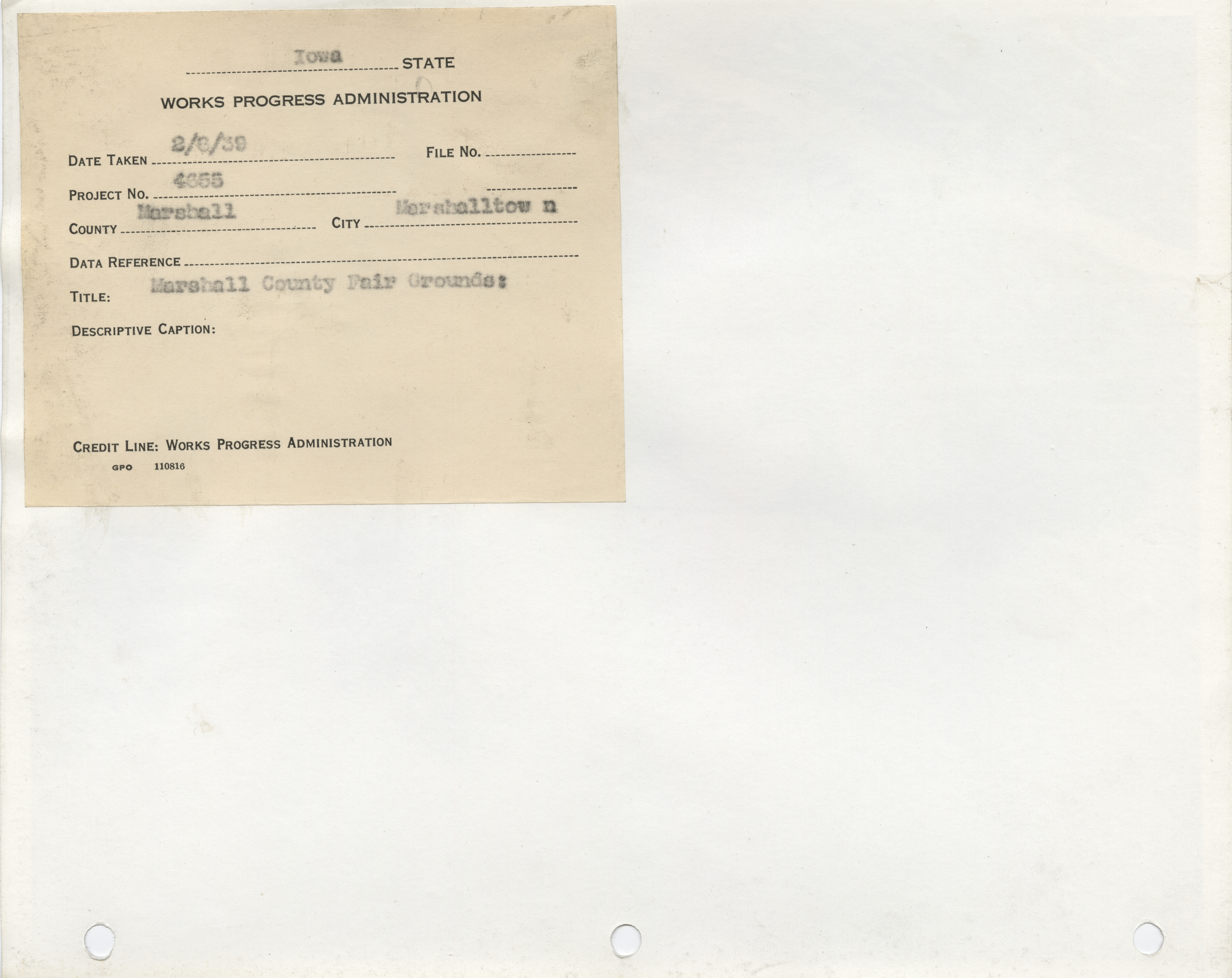 - Fairgrounds. Marshalltown. Marshall County Fairgrounds. Project 4655. (2 b/w photographs), 1939