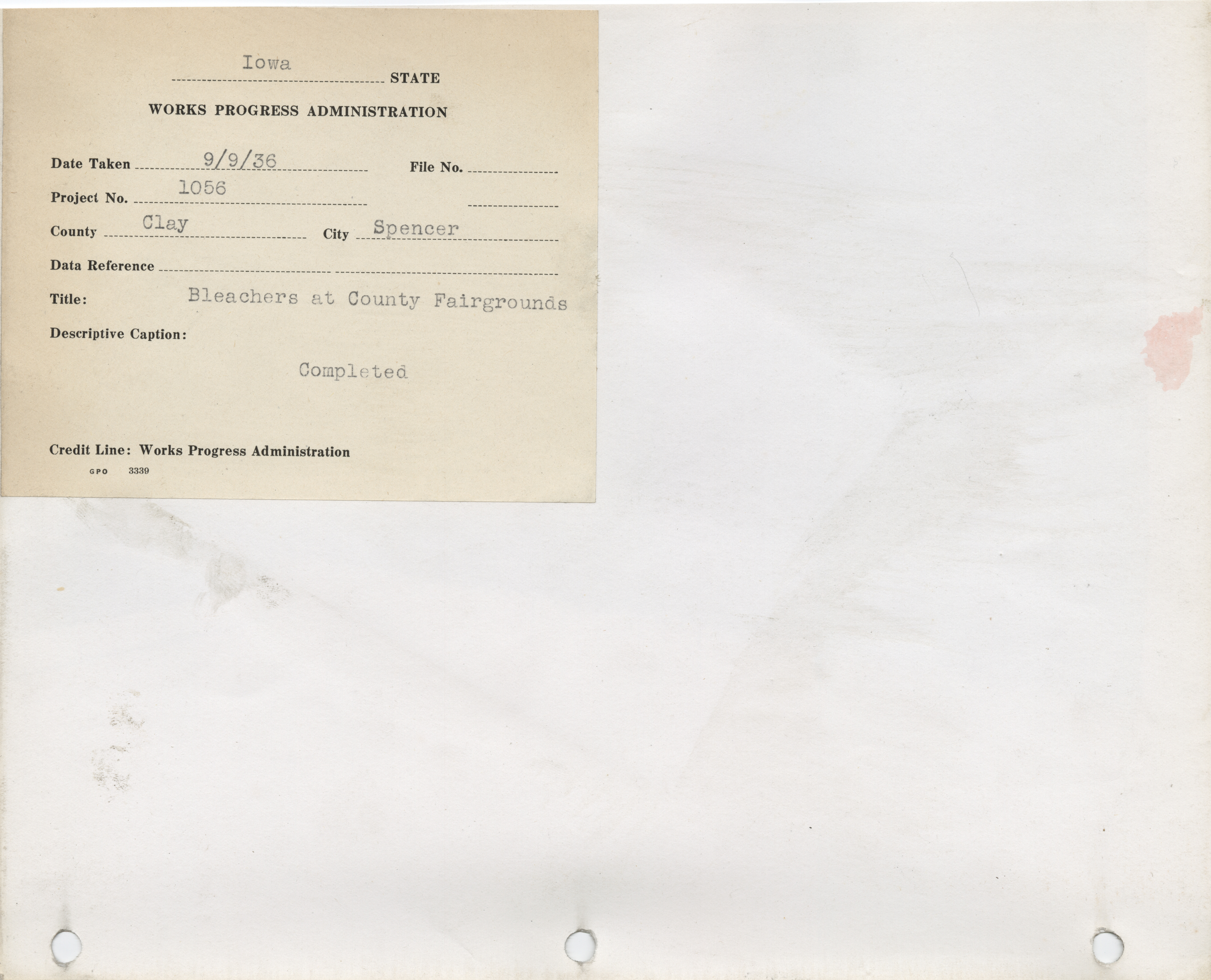 - "Photograph of bleachers at Clay County Fairgrounds", Work Projects Administration (Iowa) Photographs, Iowa State University Library Digital Collections