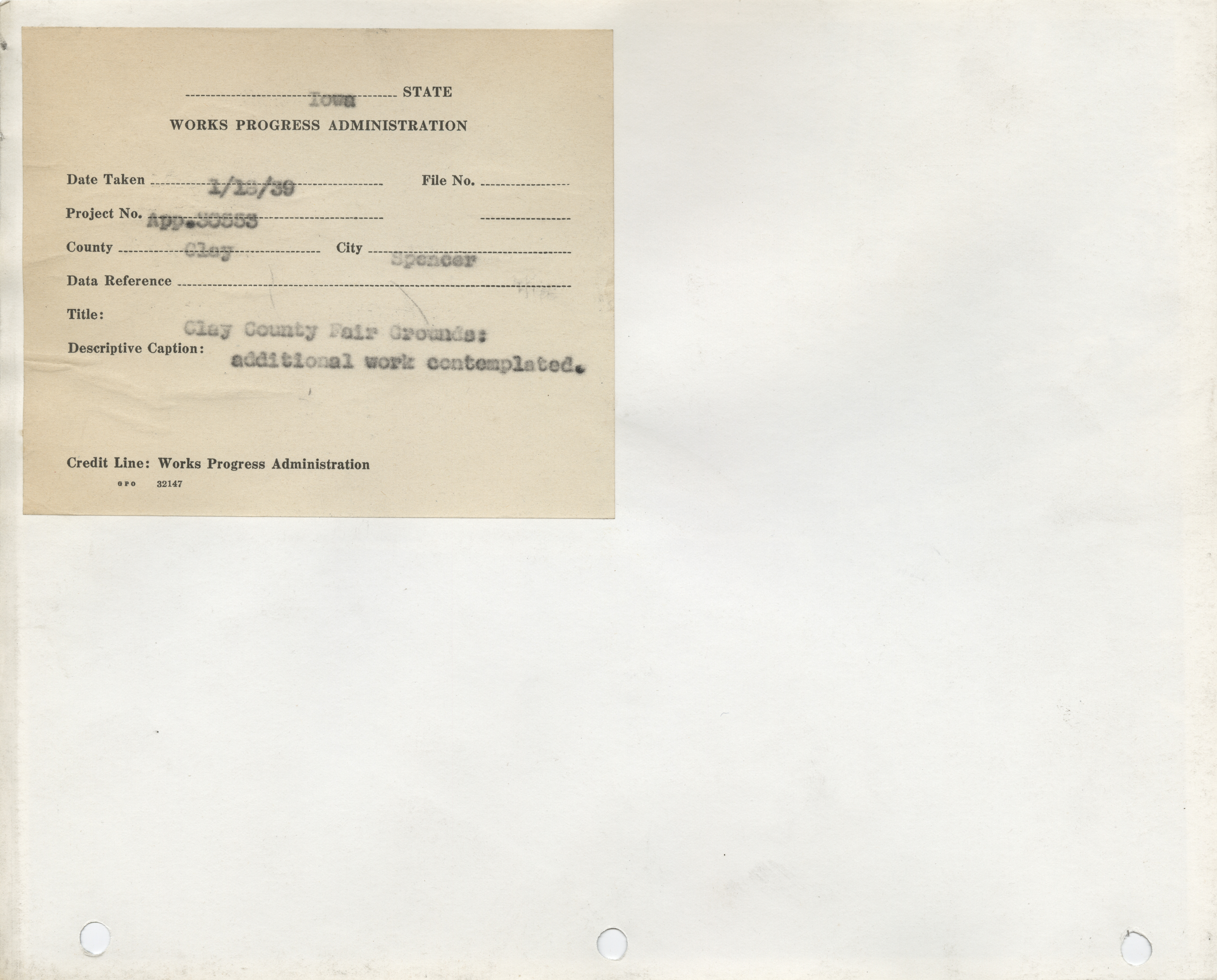 - Fairgrounds. Spencer. Clay County Fairgrounds. Application 20553. (3 b/w photographs), 1939