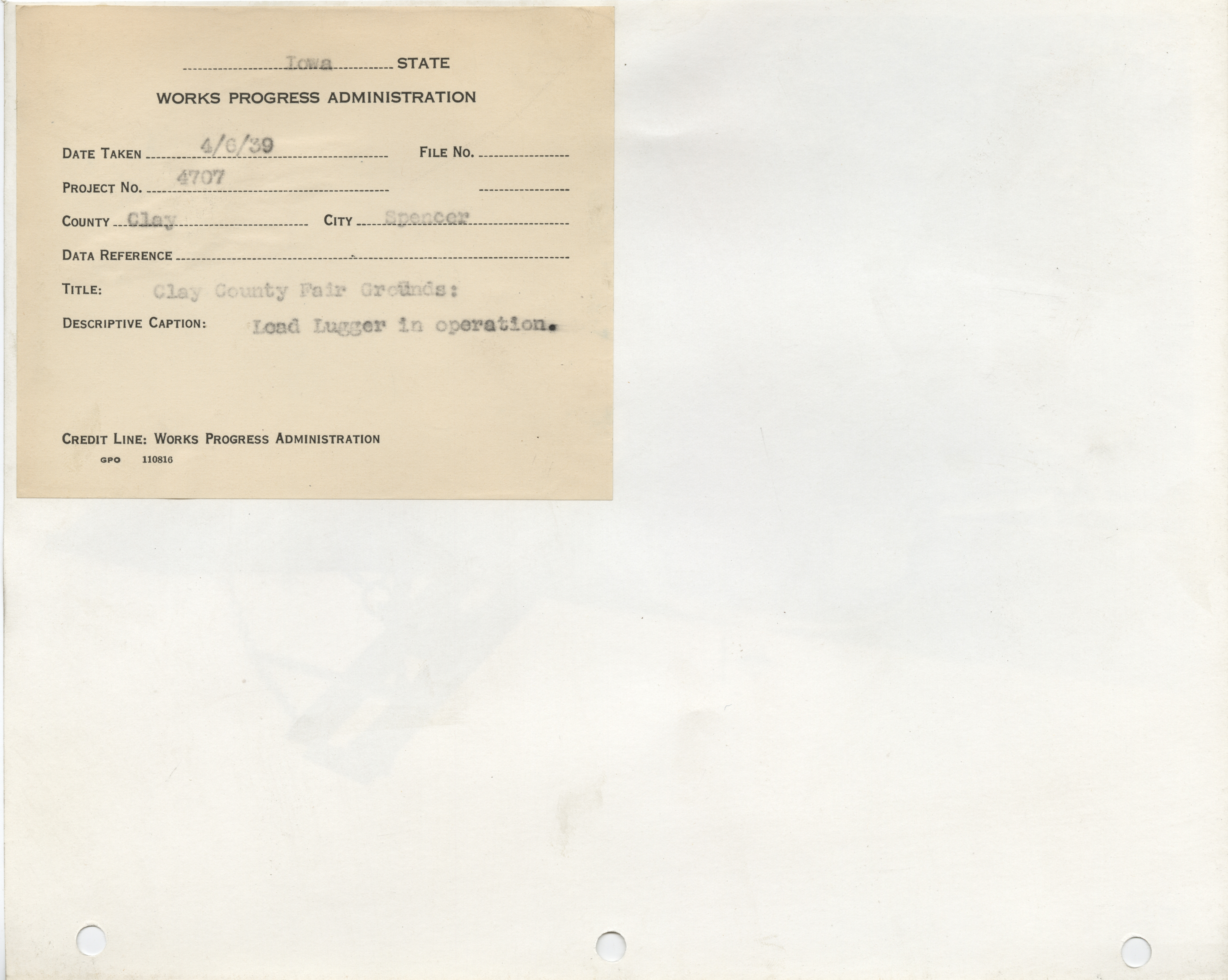 - "Photograph of load lugger operating in Clay County Fairgrounds", Work Projects Administration (Iowa) Photographs, Iowa State University Library Digital Collections