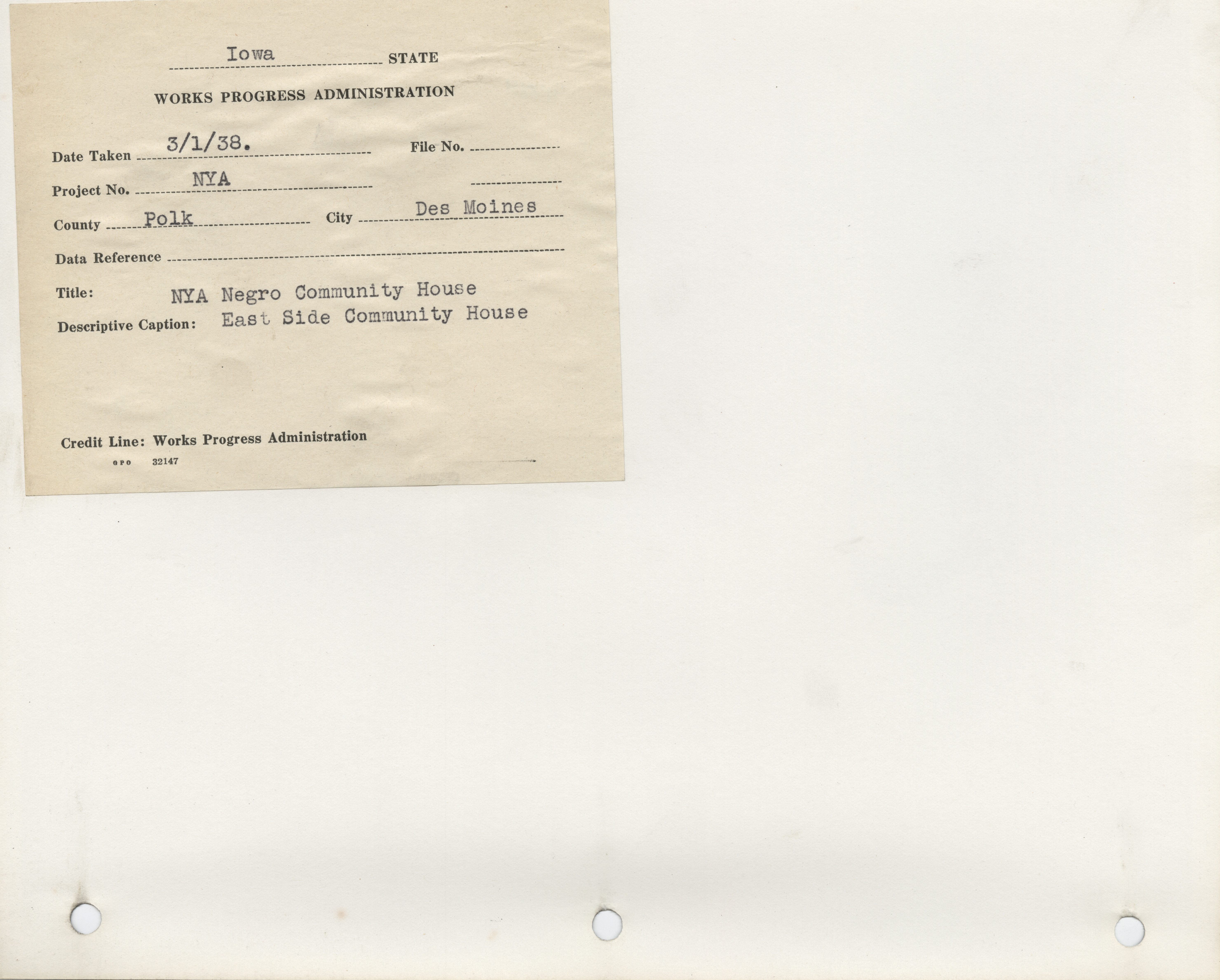 - National Youth Administration. Polk County. Des Moines. East Side Community House. (2 b/w photographs), 1938