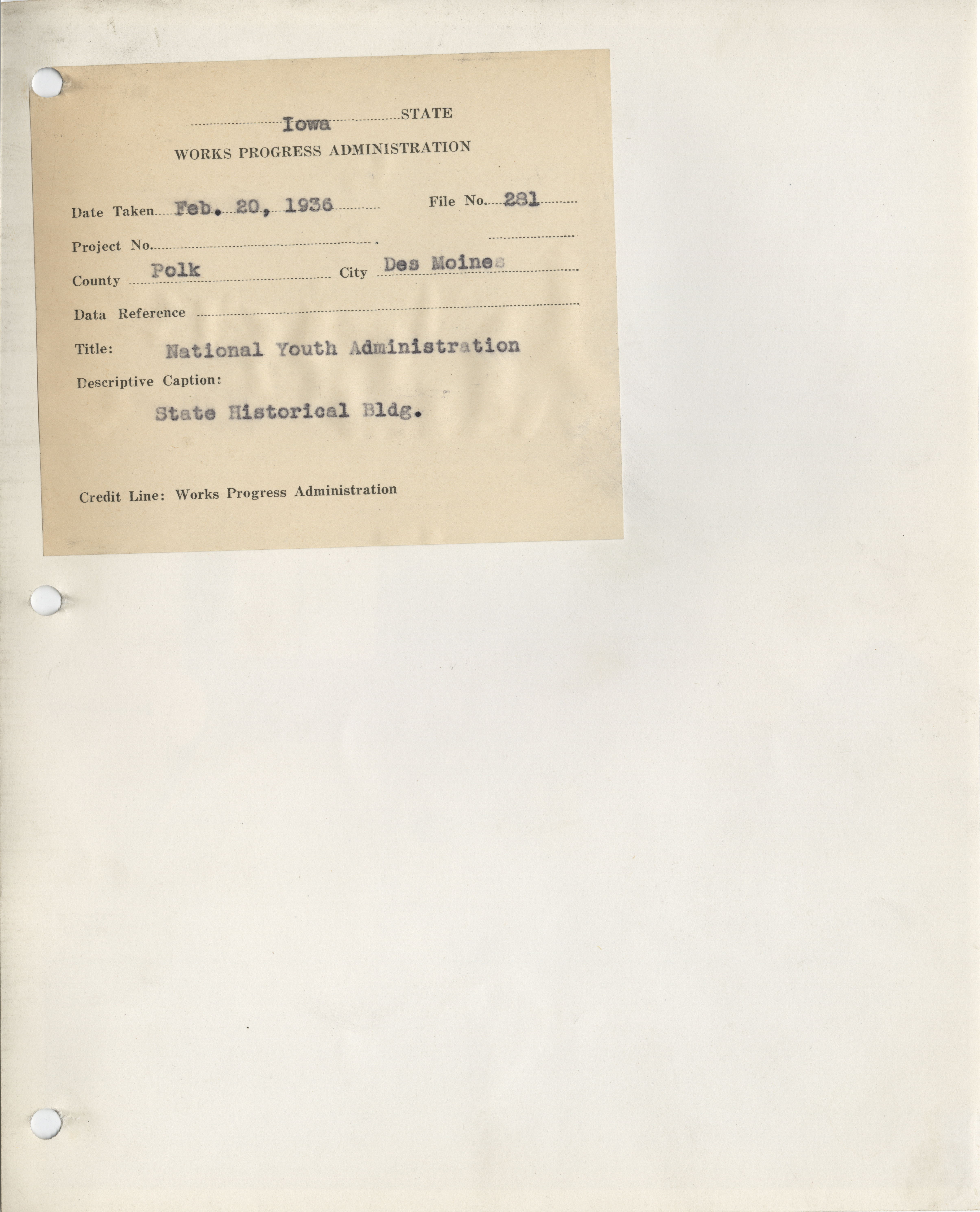 - "Photograph of the National Youth Administration at the State Historical Building in Des Moines", Work Projects Administration (Iowa) Photographs, Iowa State University Library Digital Collections