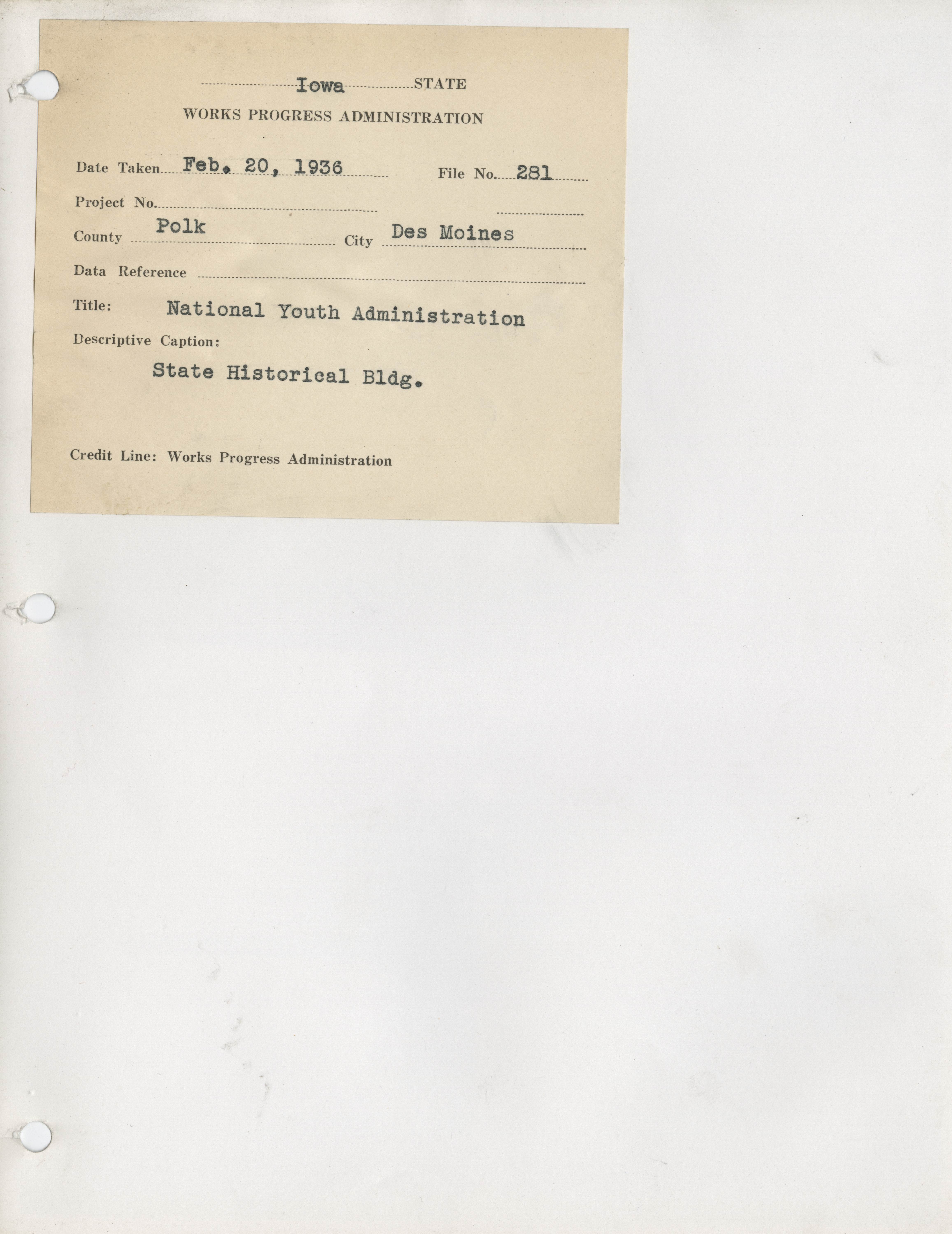 - National Youth Administration. Polk County. Des Moines. State Historical Building. (3 b/w photographs), 1936
