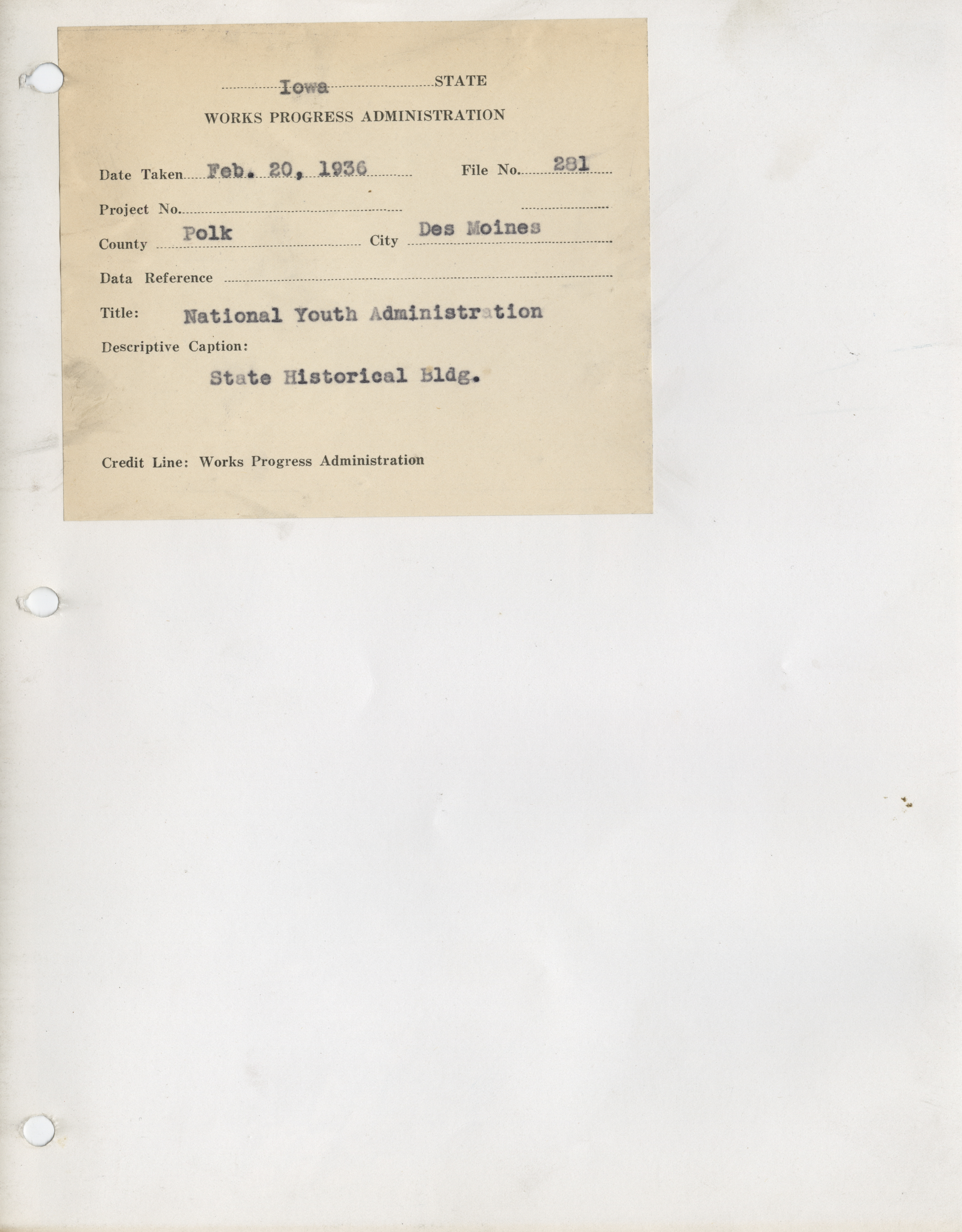 - "Photograph of the National Youth Administration at the State Historical Building in Des Moines", Work Projects Administration (Iowa) Photographs, Iowa State University Library Digital Collections