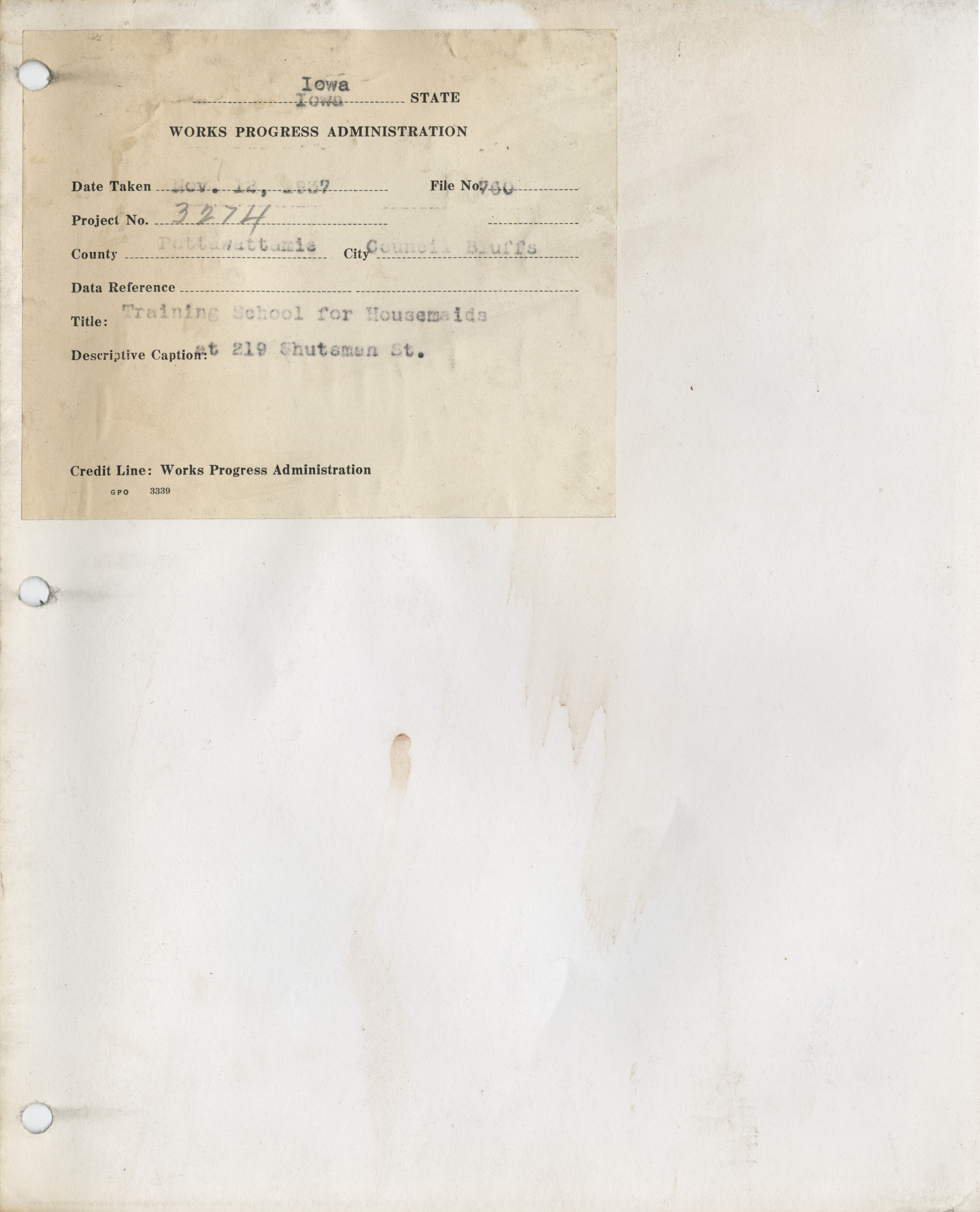 - "Photograph of a training school for housemaids in Council Bluffs", Work Projects Administration (Iowa) Photographs, Iowa State University Library Digital Collections