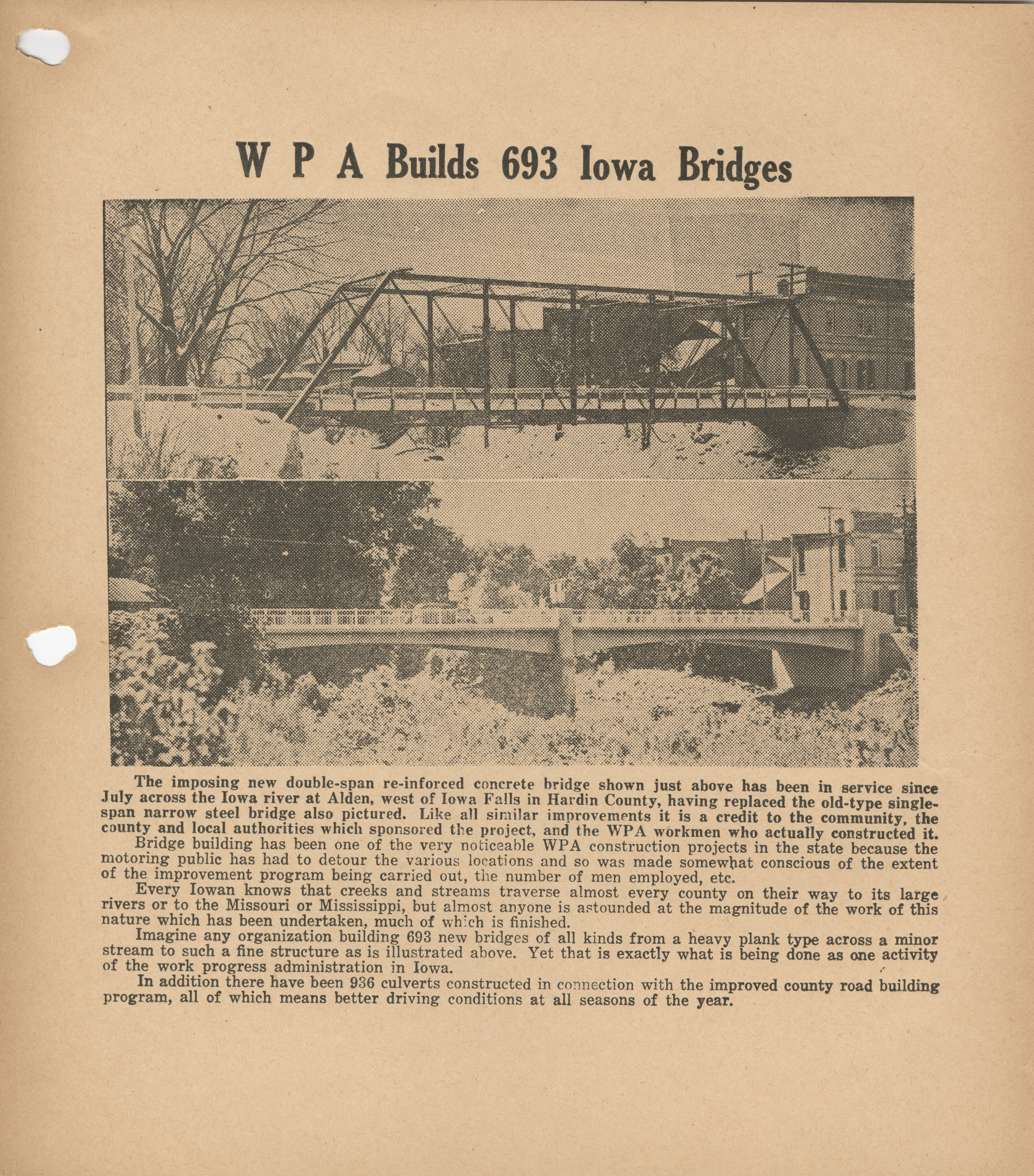 - "WPA builds 693 Iowa bridges", Work Projects Administration (Iowa) Photographs, Iowa State University Library Digital Collections