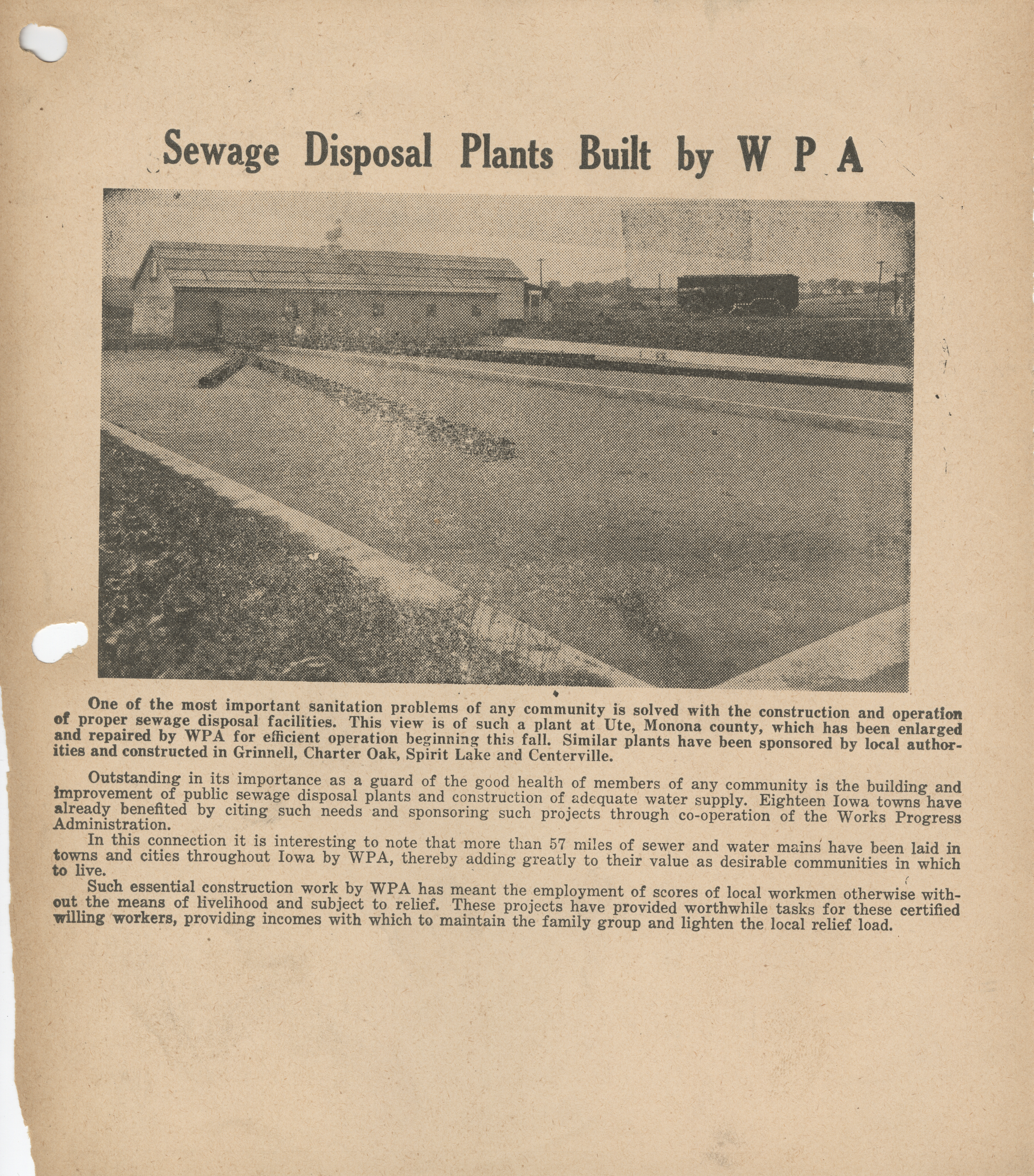 - "Sewage disposal plants built by WPA", Work Projects Administration (Iowa) Photographs, Iowa State University Library Digital Collections