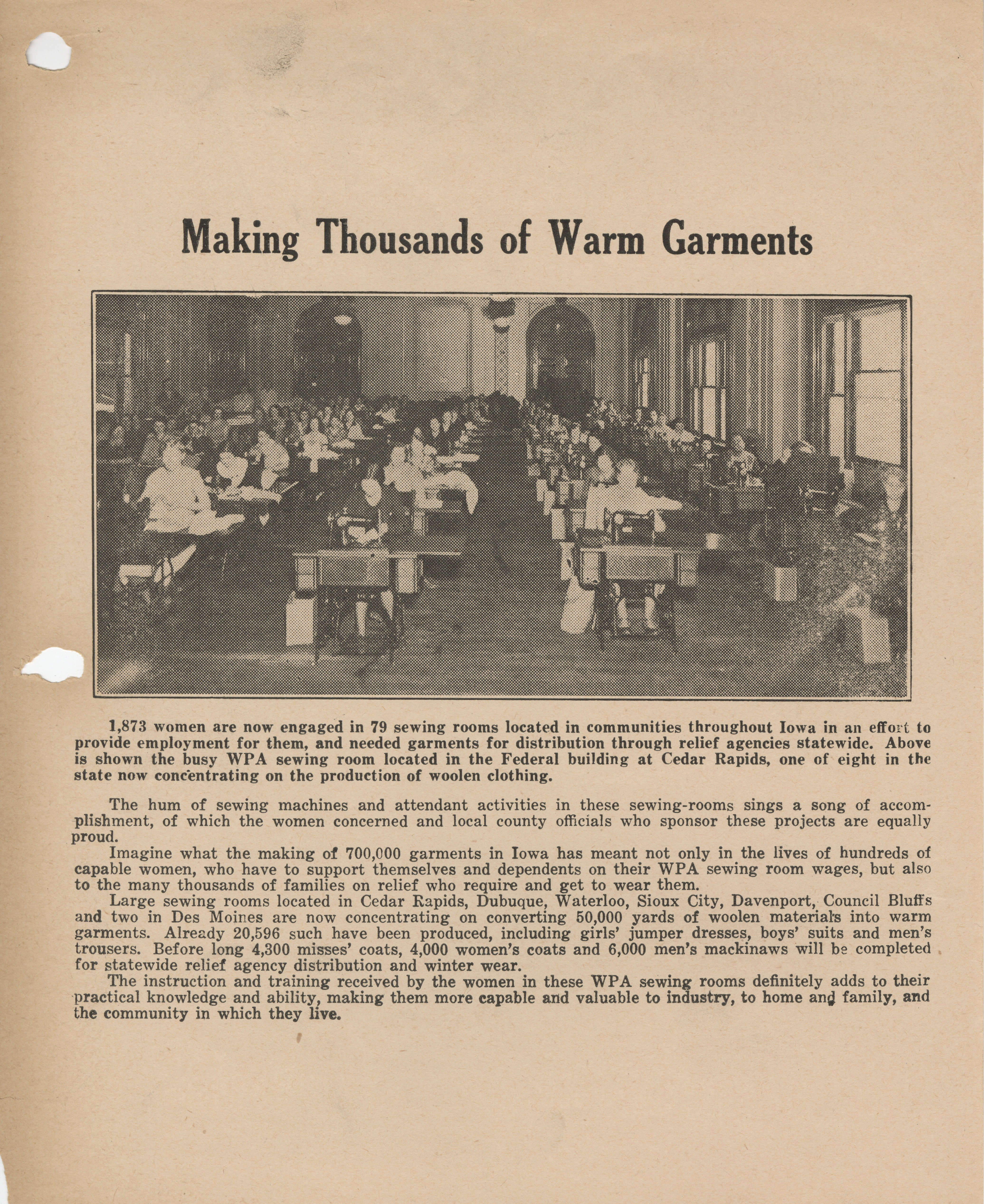 - "Making thousands of warm garments", Work Projects Administration (Iowa) Photographs, Iowa State University Library Digital Collections