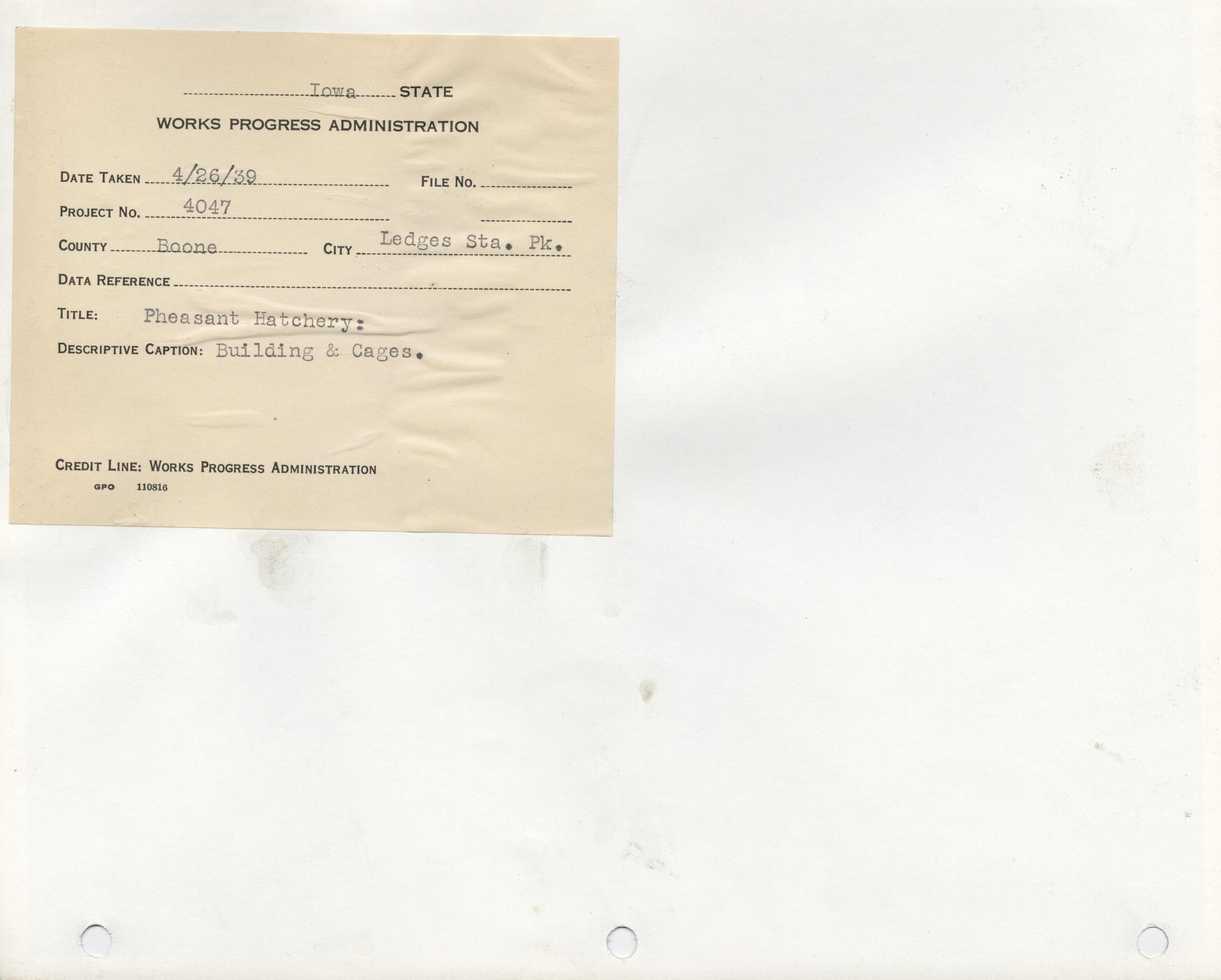 - "Photograph of people constructing cages for a pheasant hatchery at Ledges State Park in Boone County", Work Projects Administration (Iowa) Photographs, Iowa State University Library Digital Collections