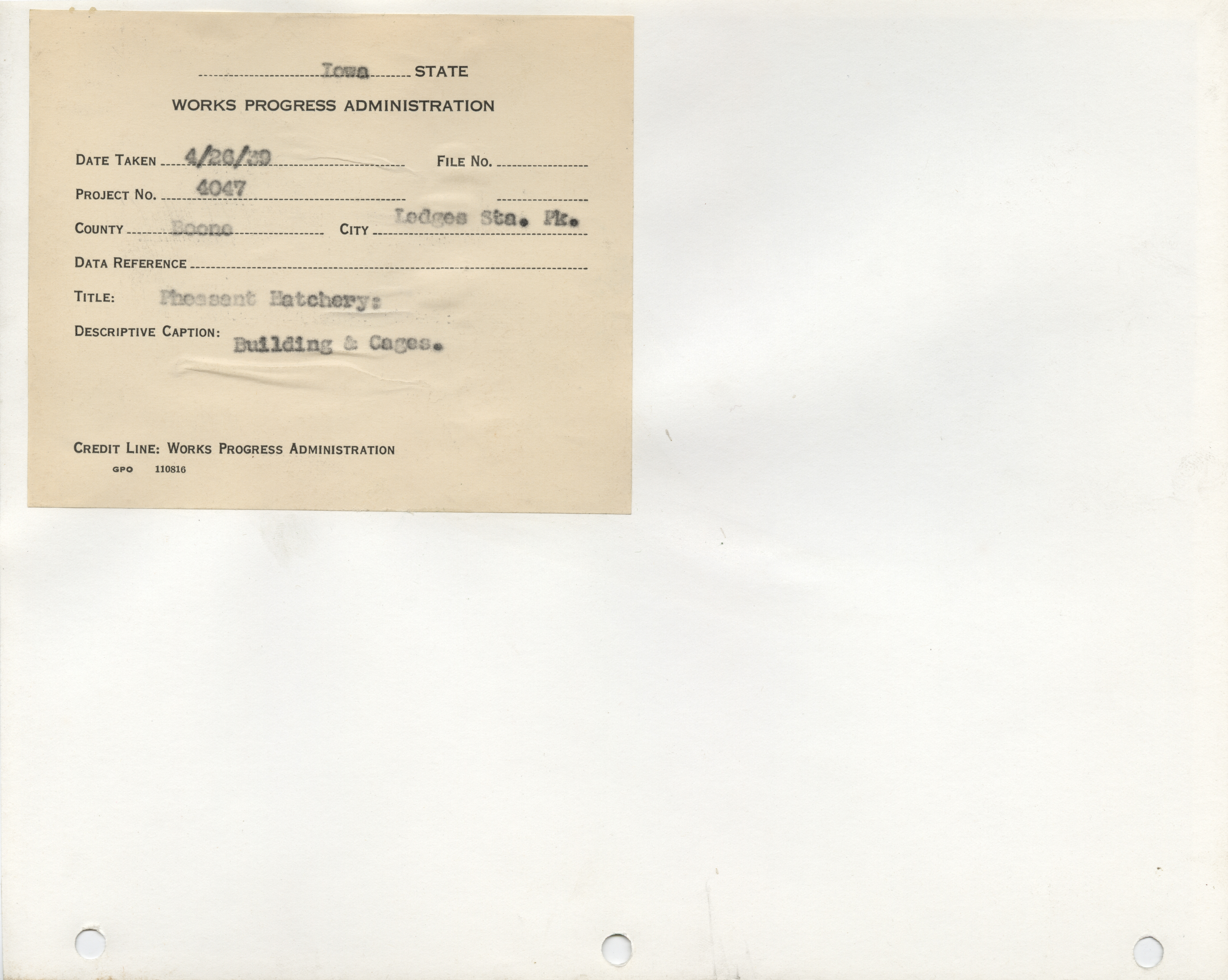 - "Photograph of the Pheasant Hatchery at Ledges State Park in Boone County", Work Projects Administration (Iowa) Photographs, Iowa State University Library Digital Collections