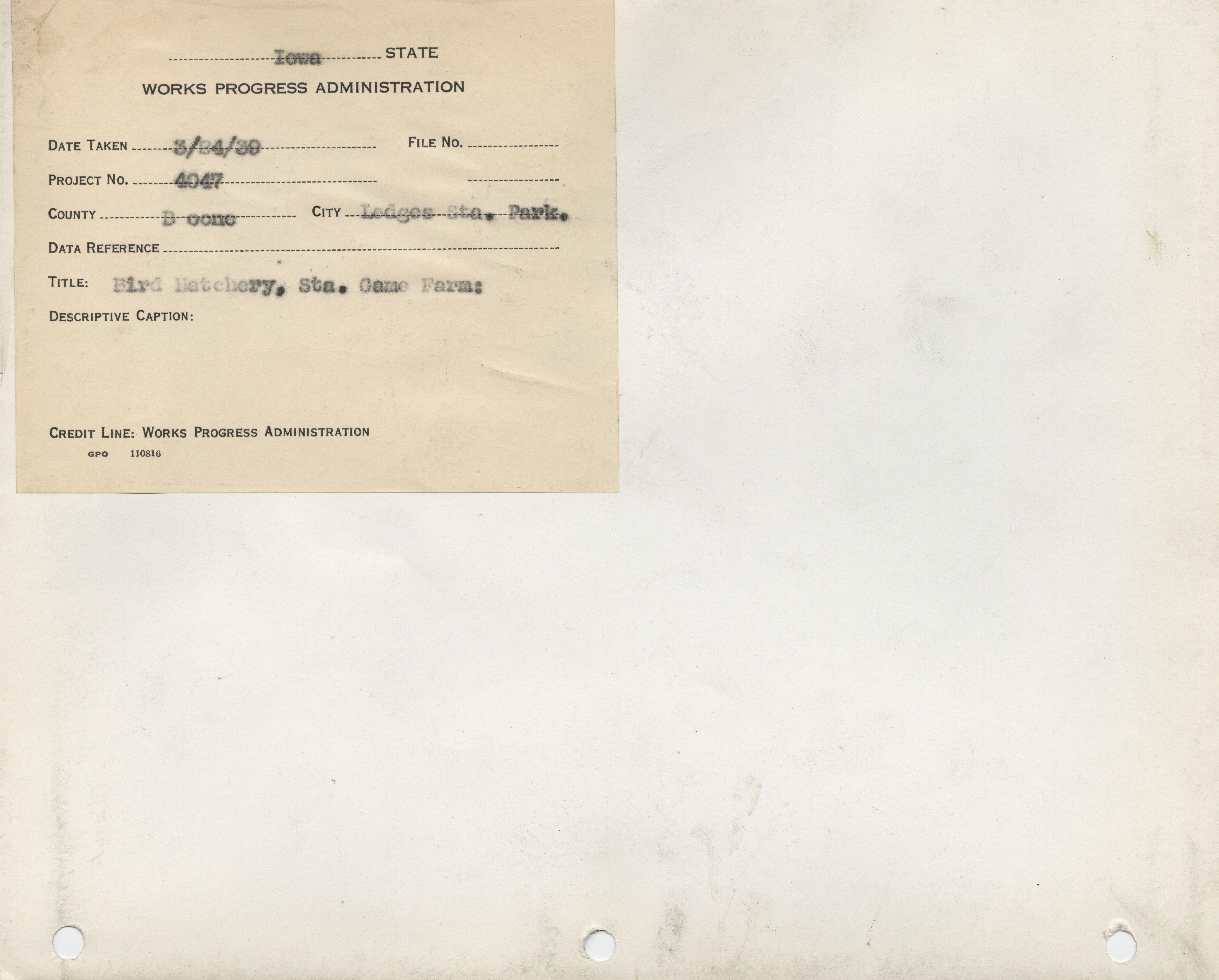 - "Photograph of the State Game Farm hatchery at Ledges State Park in Boone County", Work Projects Administration (Iowa) Photographs, Iowa State University Library Digital Collections