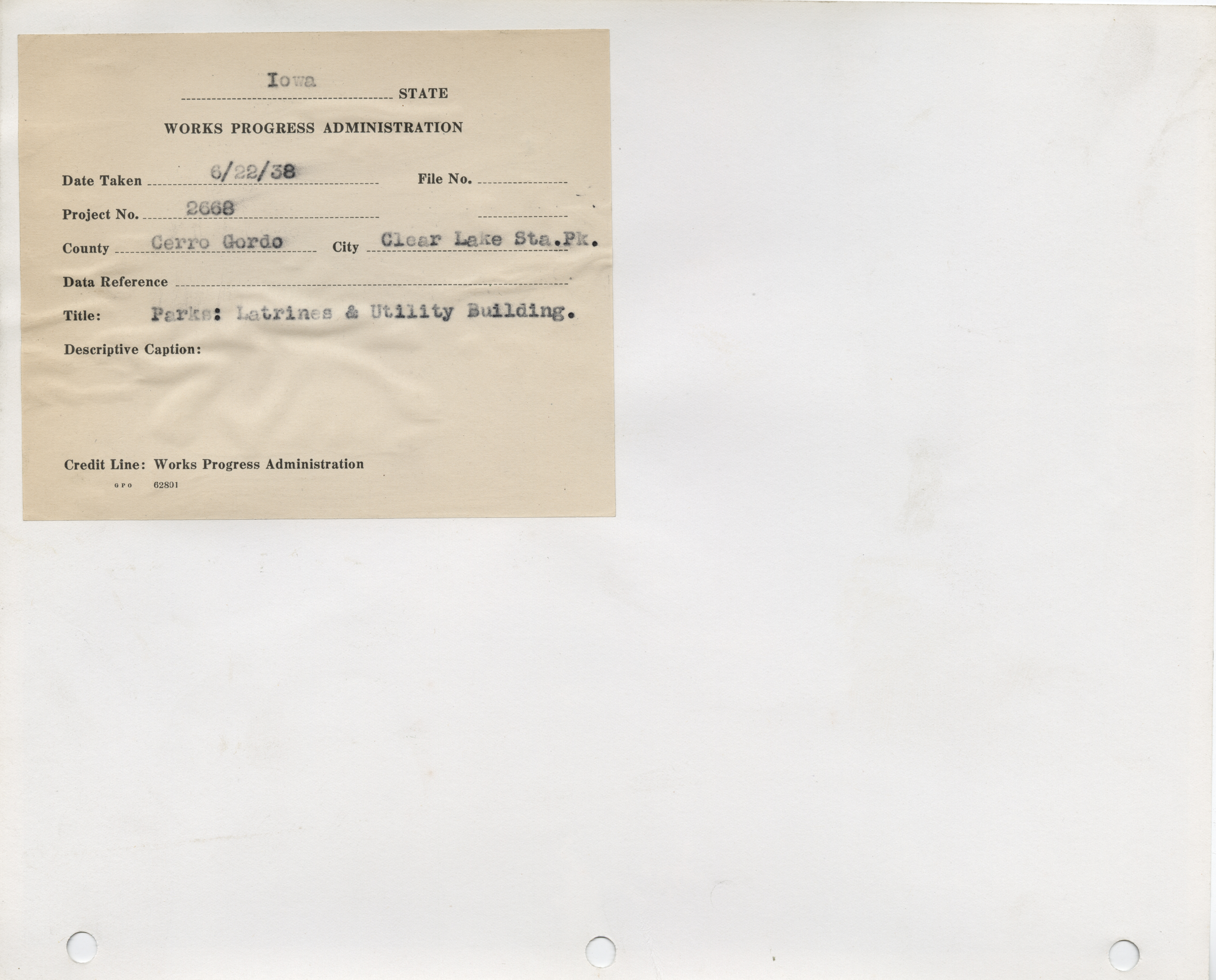 - Parks. Cerro Gordo County. Clear Lake. Clear Lake State Park Shelter Houses and Latrines. Project 2668. (9 b/w photographs), 1938-1939, undated