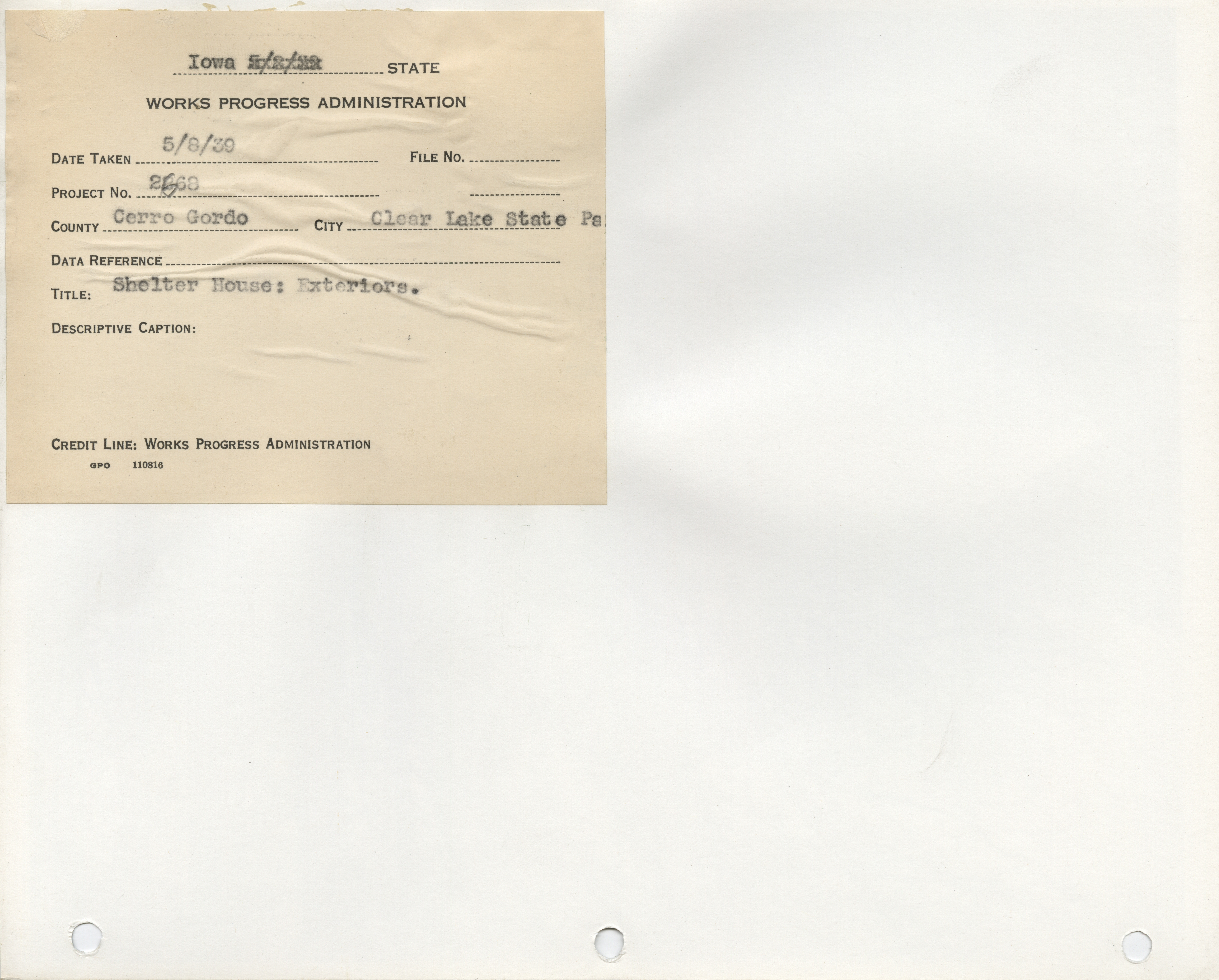 - "Photograph of a shelter house at Clear Lake State Park in Cerro Gordo County", Work Projects Administration (Iowa) Photographs, Iowa State University Library Digital Collections