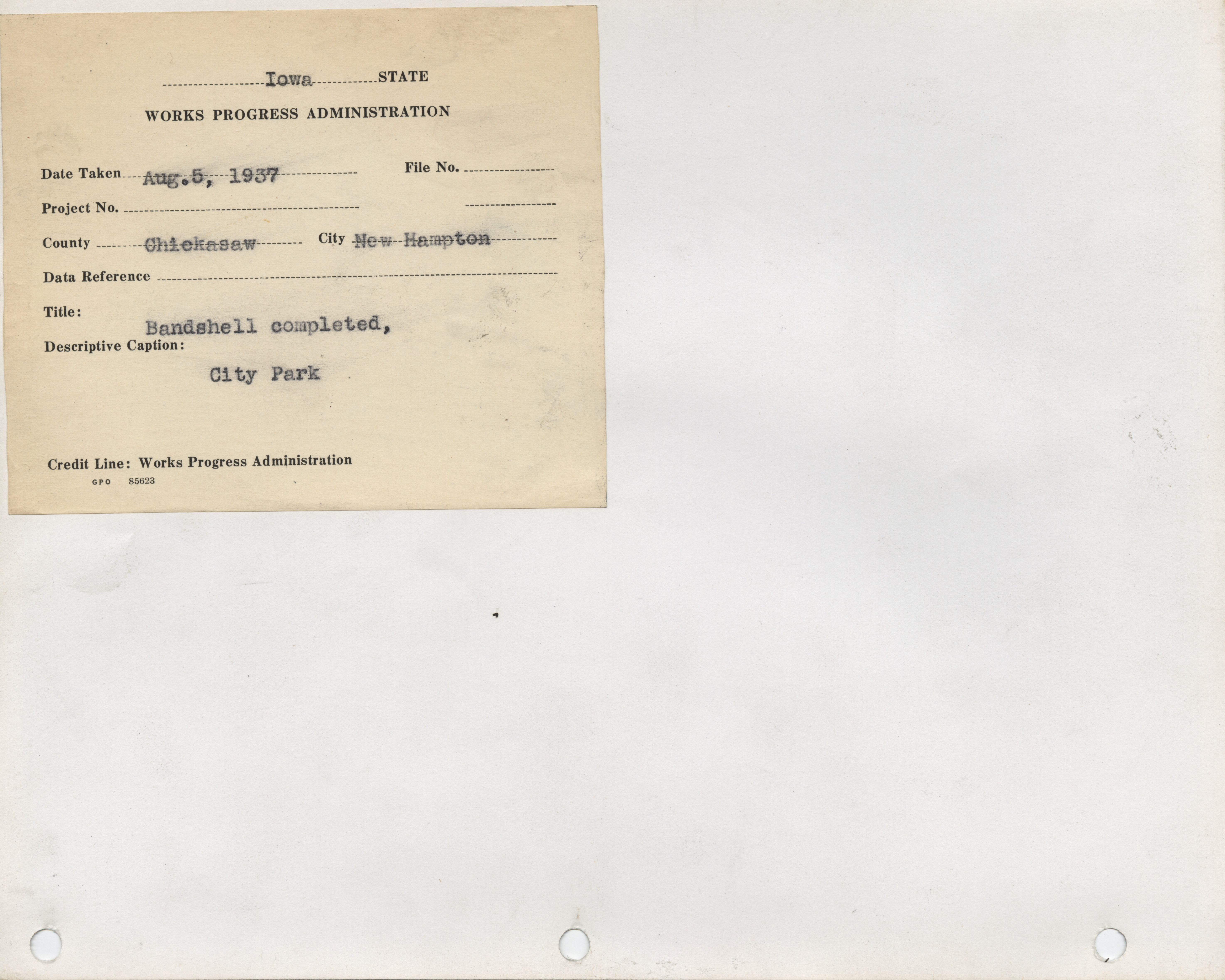 - Parks. Chickasaw County. New Hampton. Bandshell. (1 b/w photograph), 1937