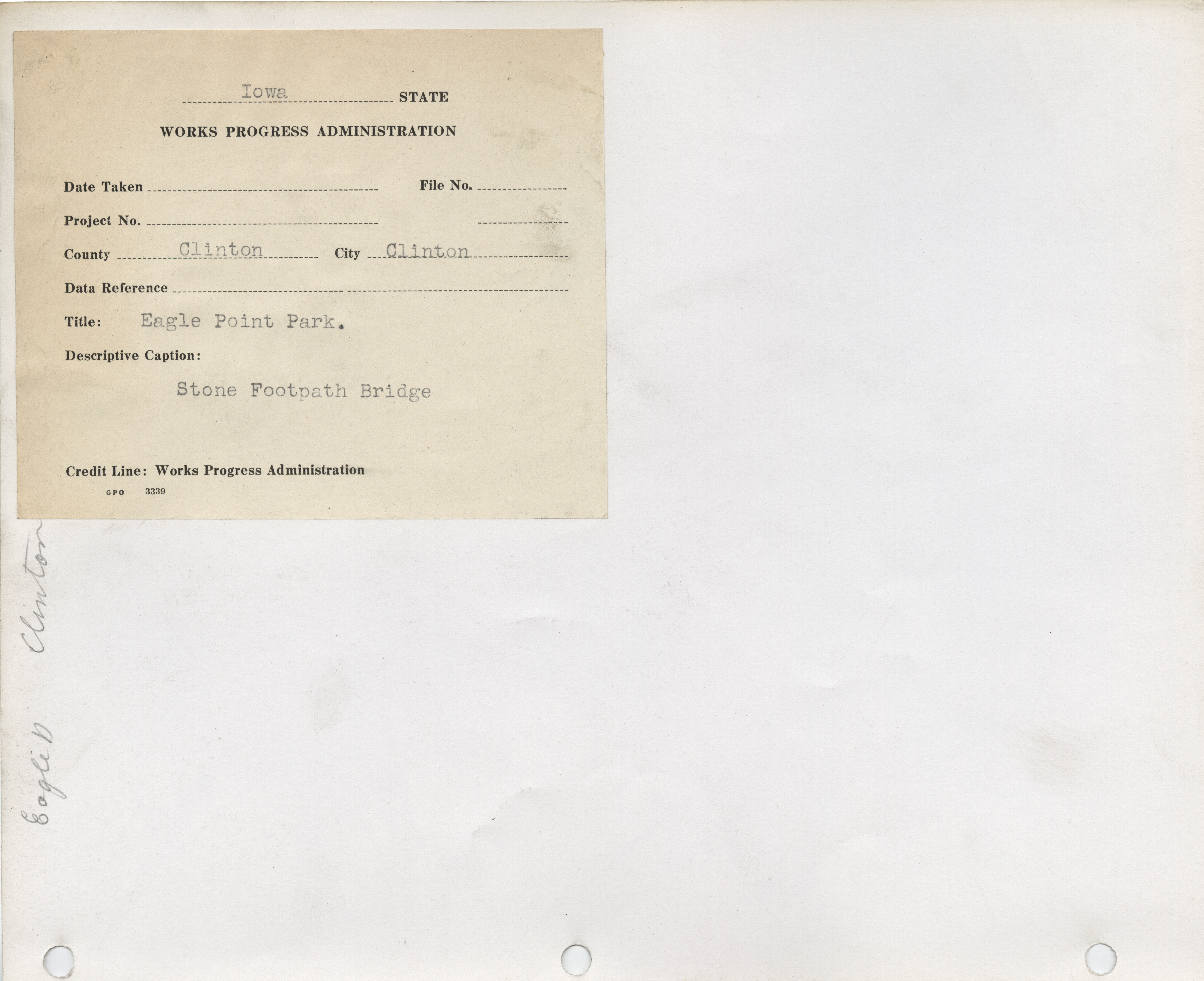 - "Photograph of a stone footbridge at Eagle Point Park in Clinton", Work Projects Administration (Iowa) Photographs, Iowa State University Library Digital Collections