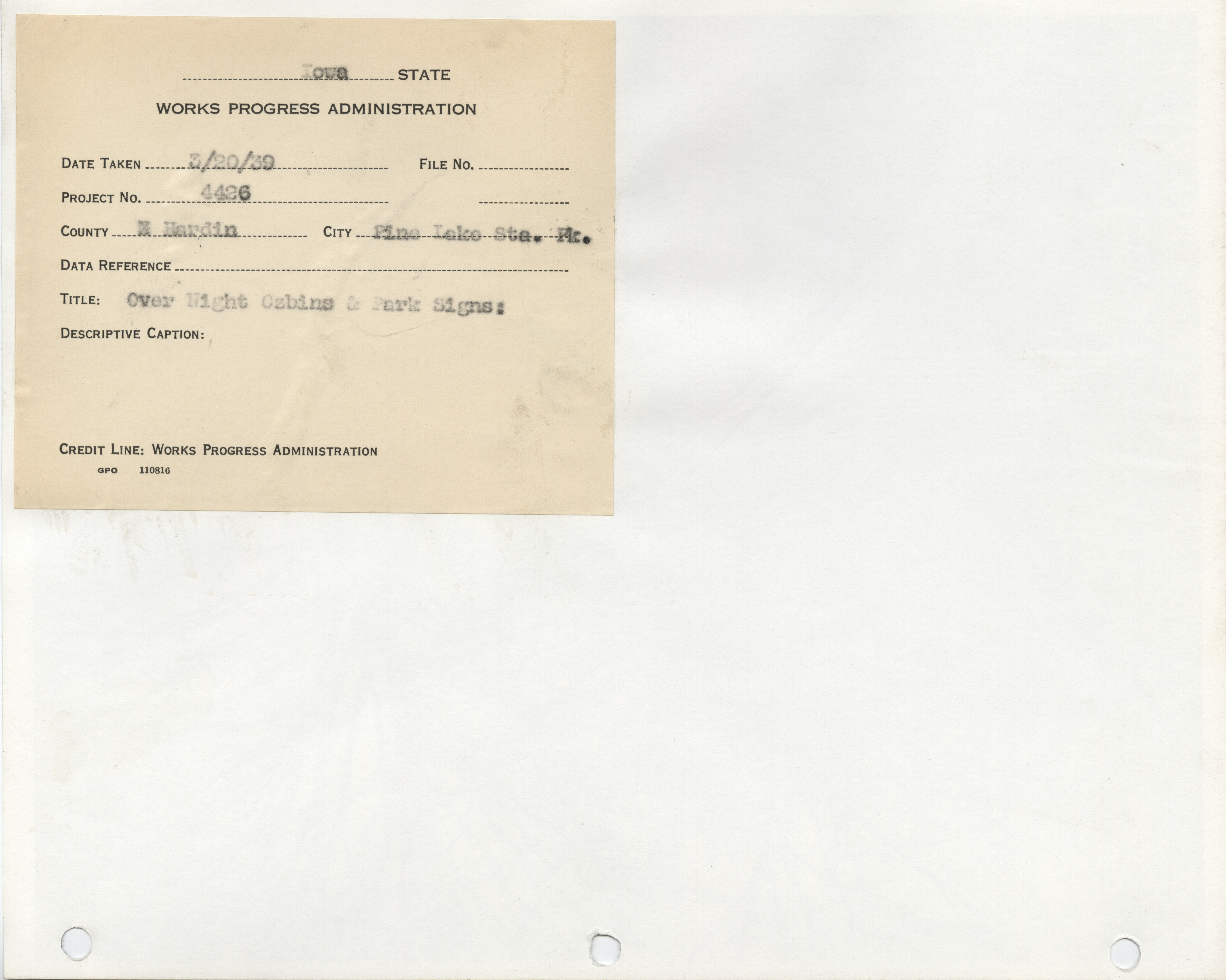 - Parks. Hardin County. Pine Lake State Park. Cabins and Signs. Project 4426. (2 b/w photographs), 1939