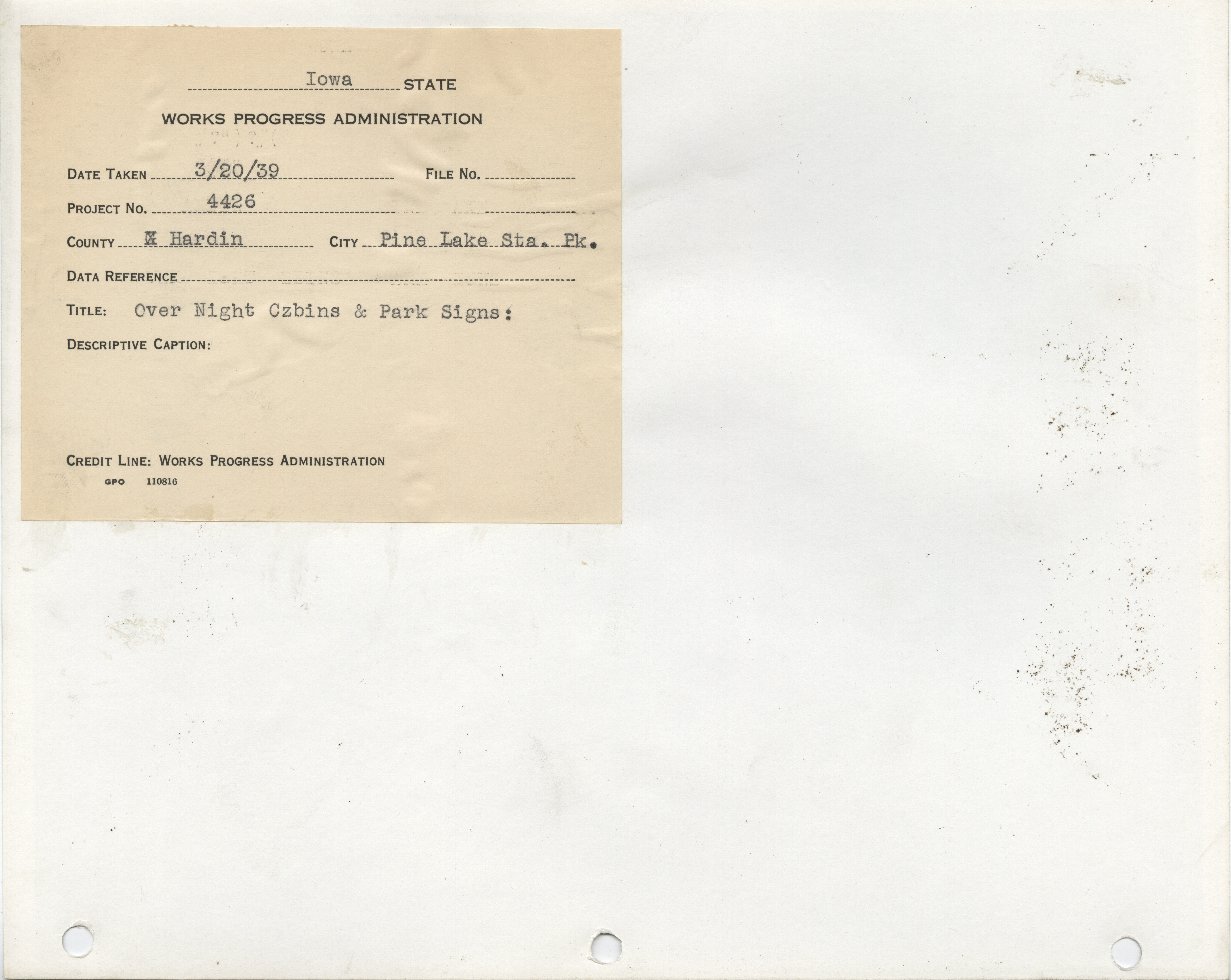 - Parks. Hardin County. Pine Lake State Park. Cabins and Signs. Project 4426. (2 b/w photographs), 1939