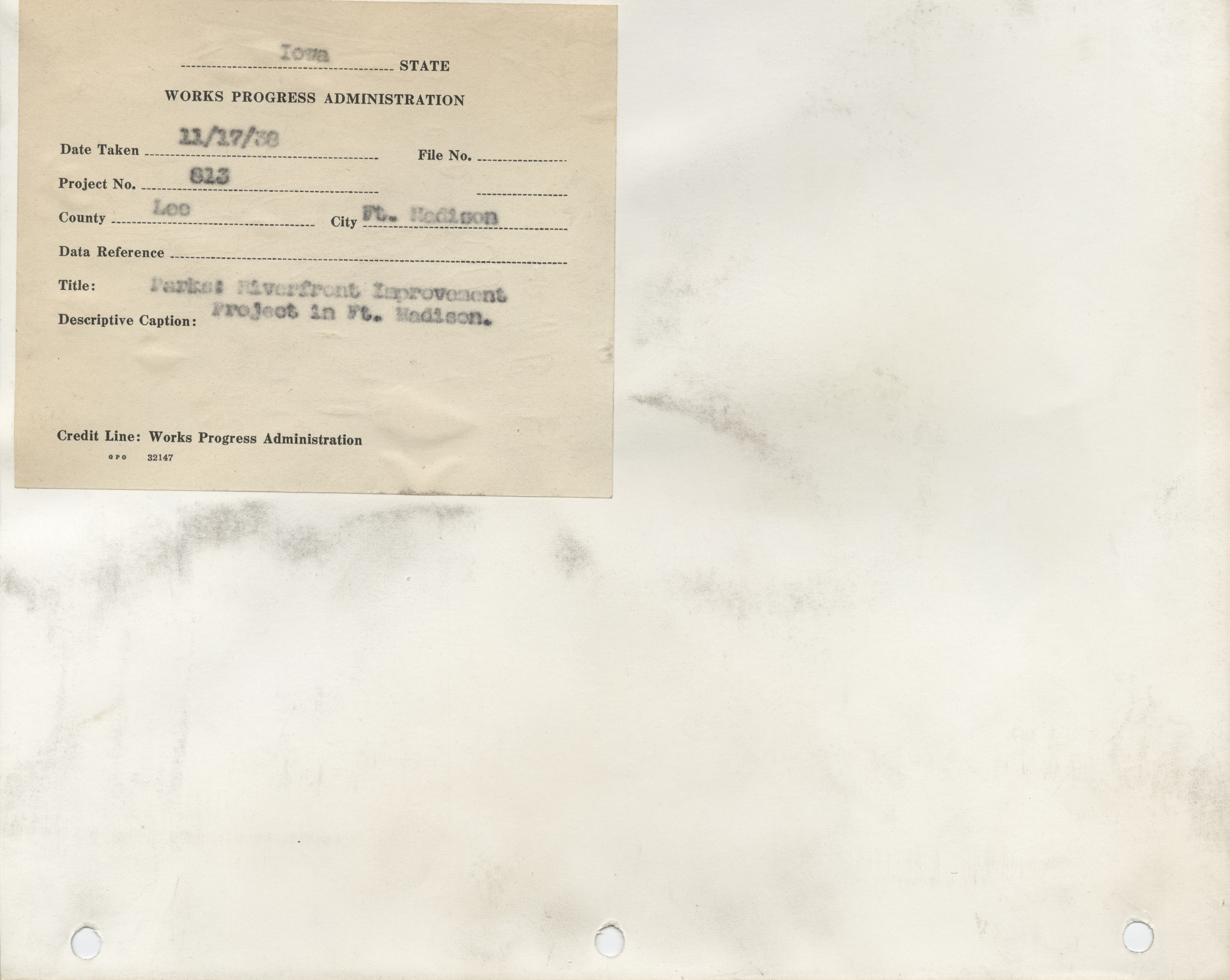 - Parks. Lee County. Fort Madison. Riverfront Improvements. Project 813. (5 b/w photographs), 1938