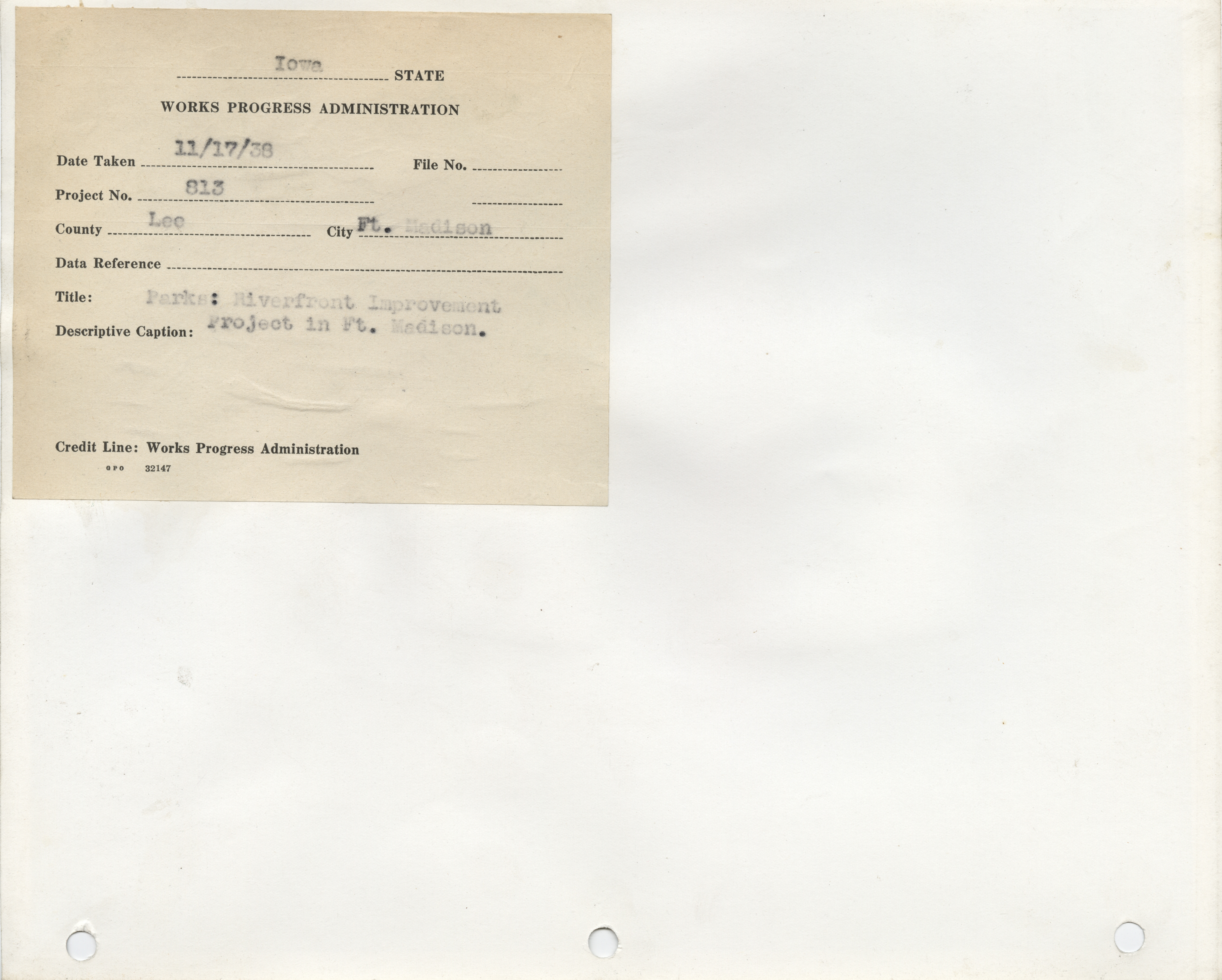 - Parks. Lee County. Fort Madison. Riverfront Improvements. Project 813. (5 b/w photographs), 1938